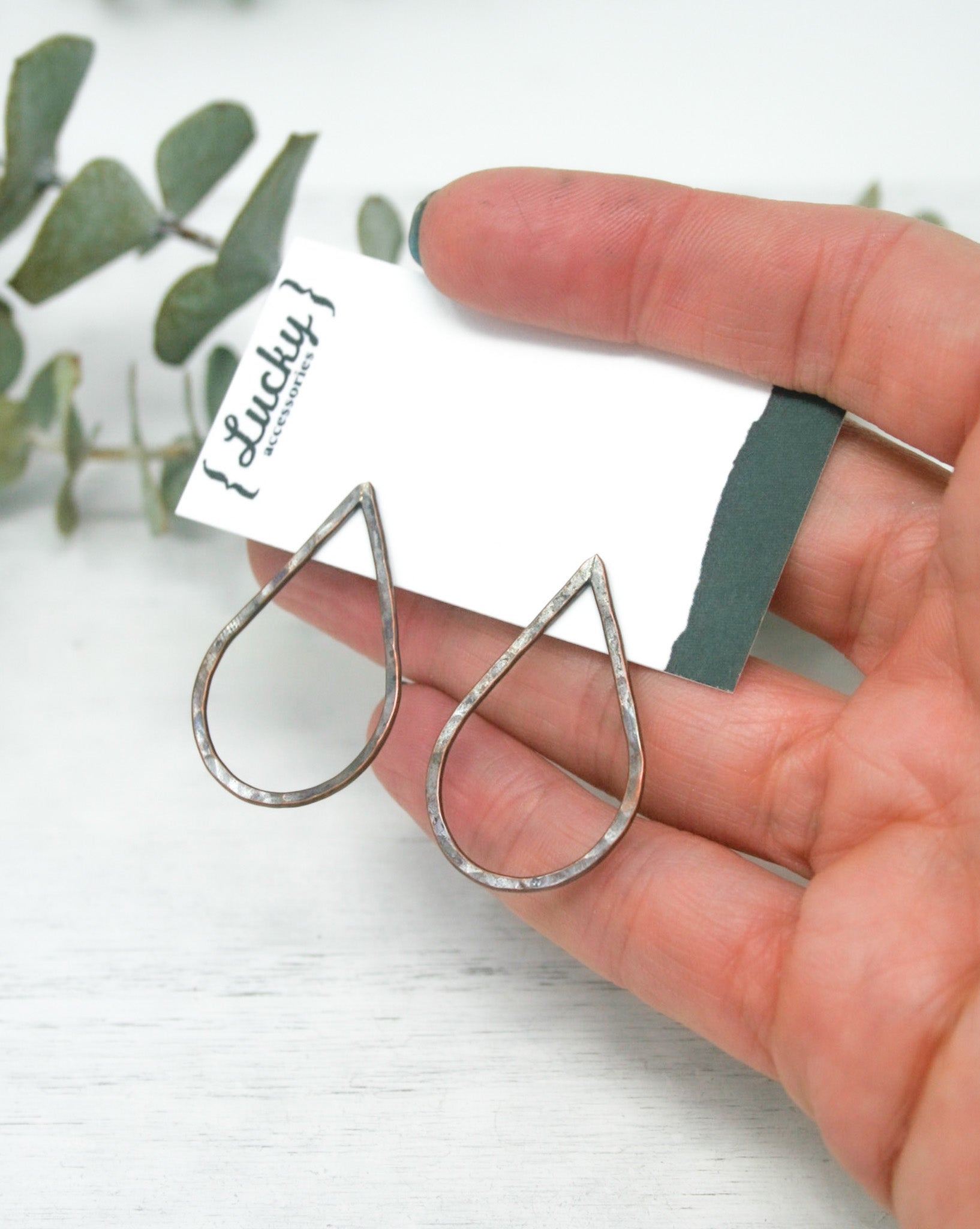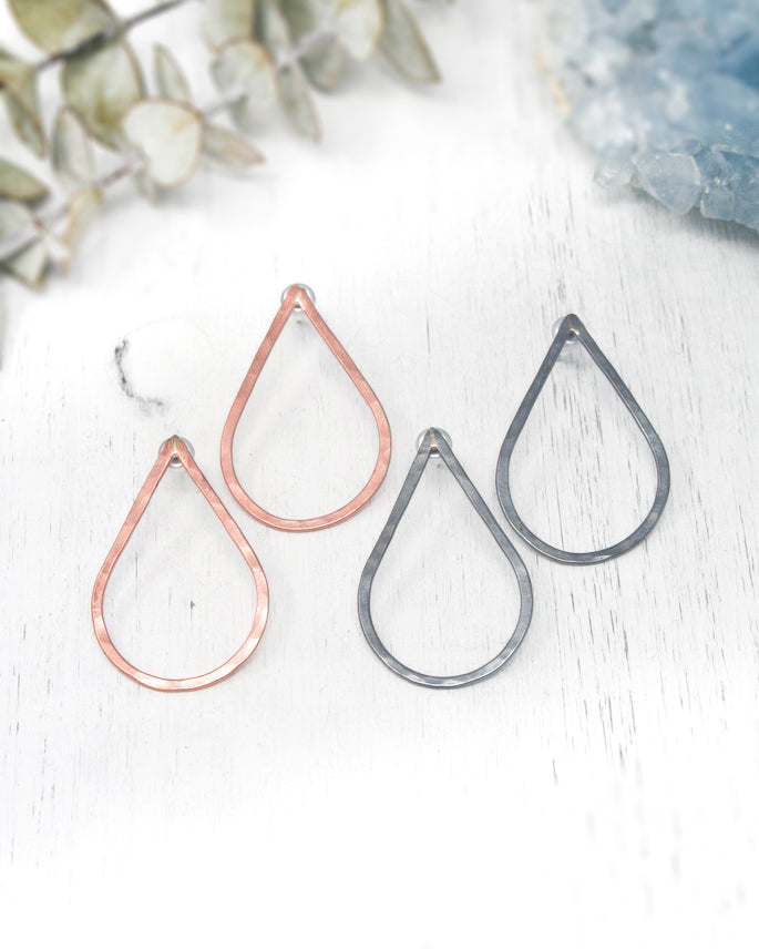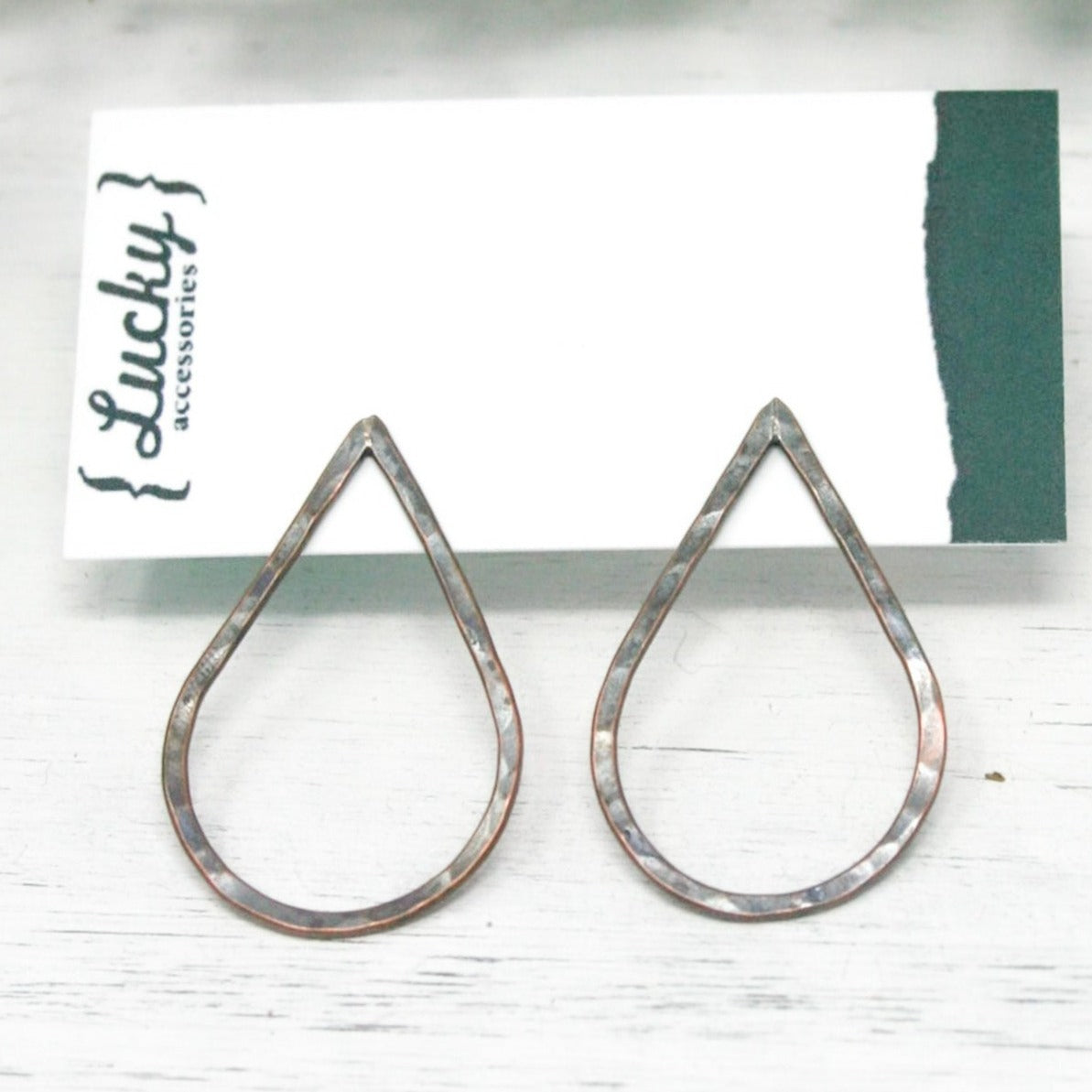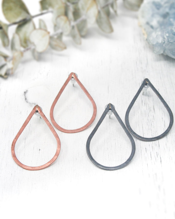 Enhance your personal style with our handmade copper drop earrings. Hand made with care, these simple yet captivating earrings feature large teardrop designs with a unique copper or black patina texture.