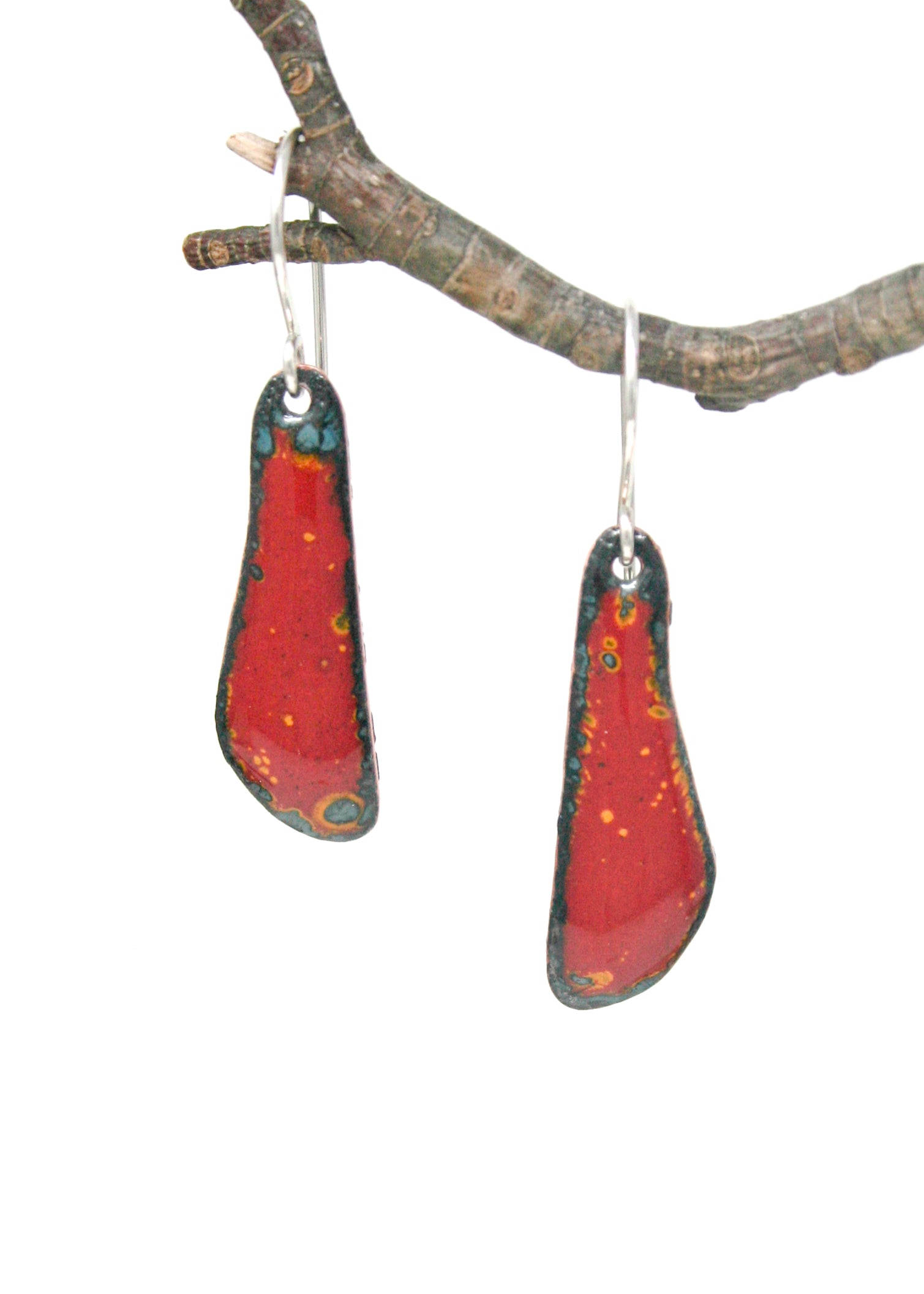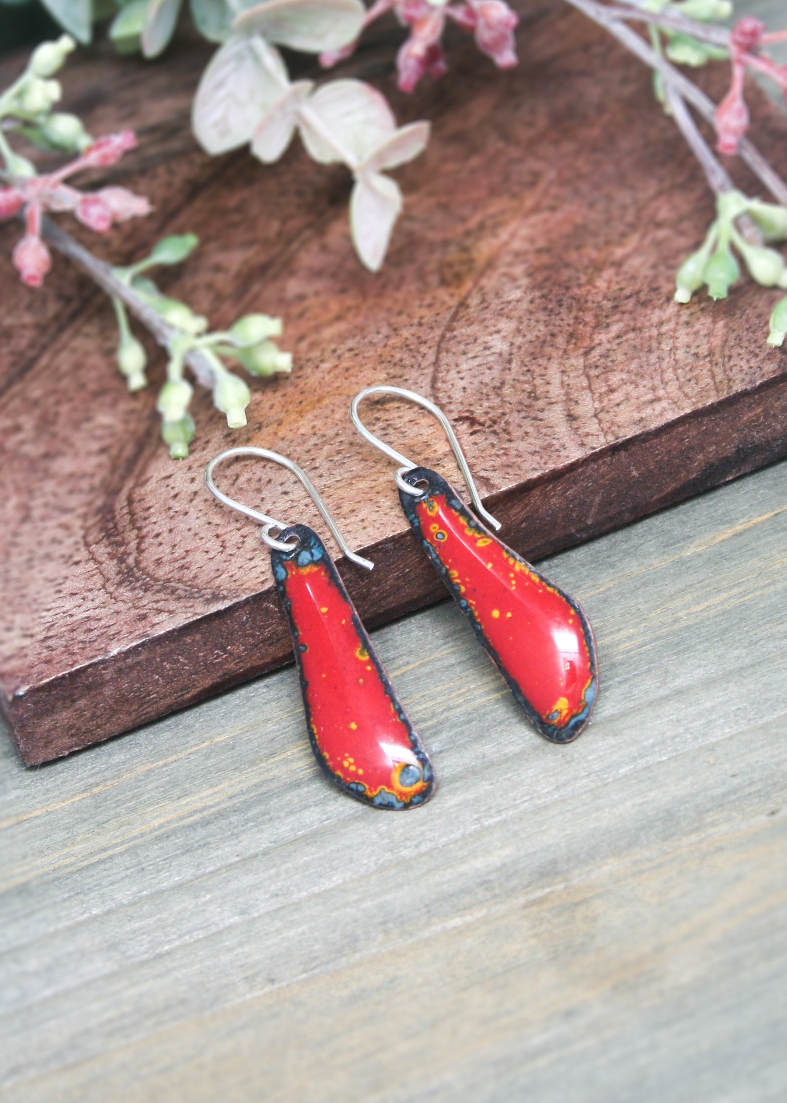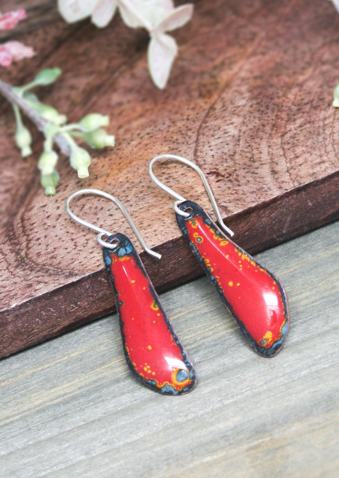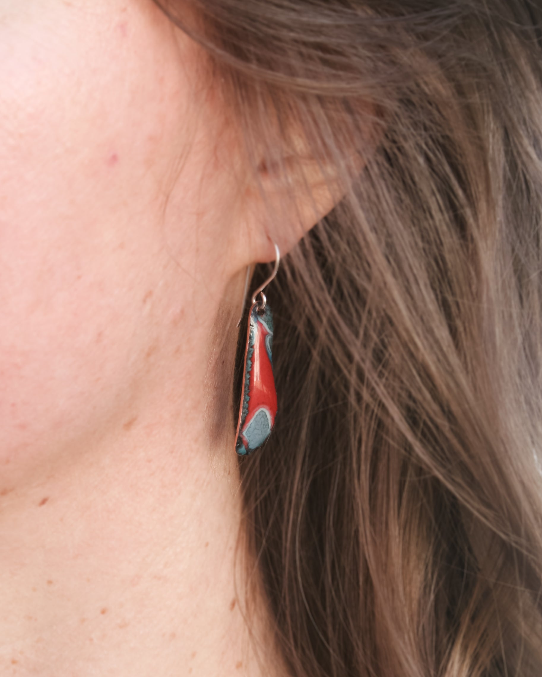 One of a kind earrings with blended enamel on copper, finished with a sterling silver hook.