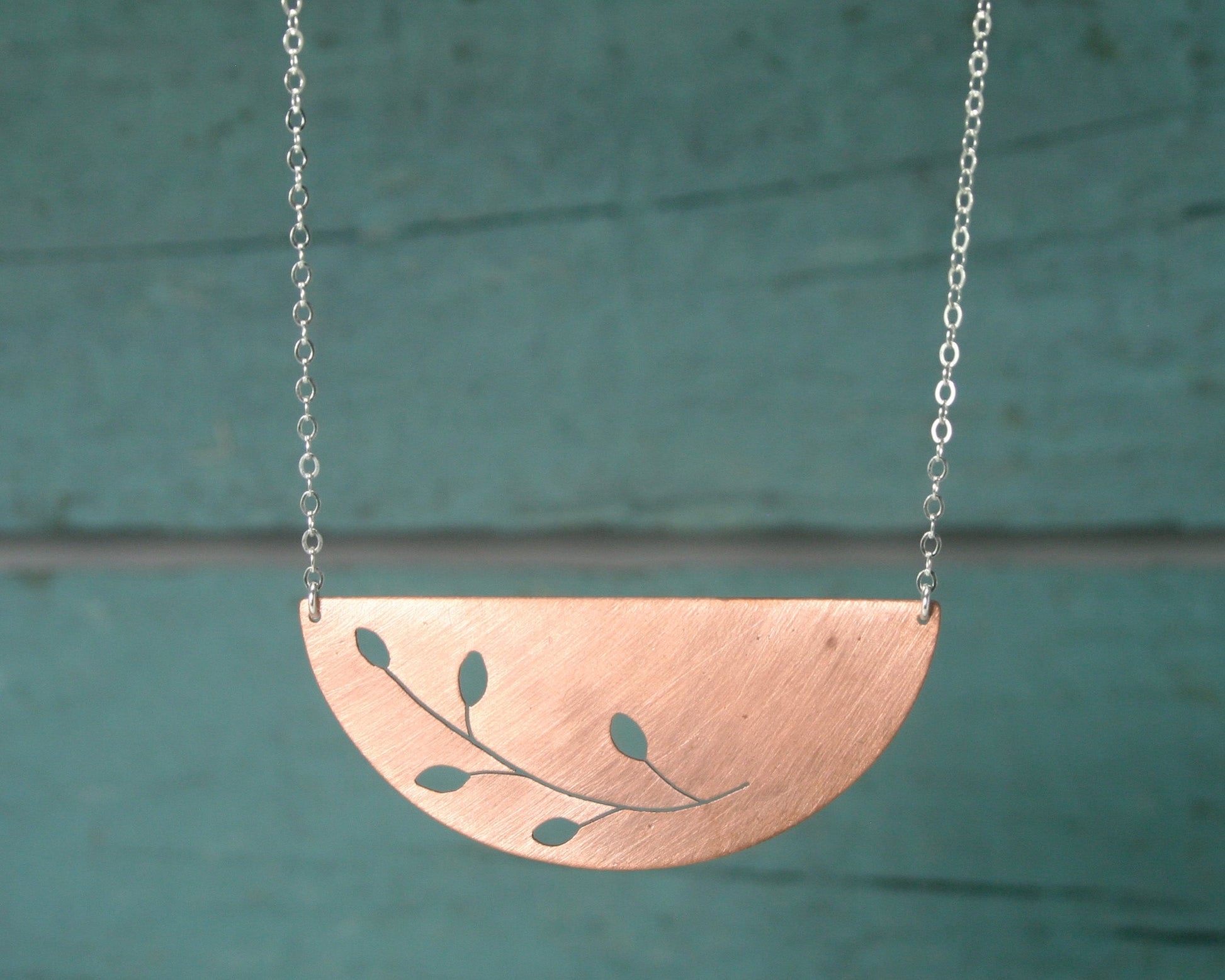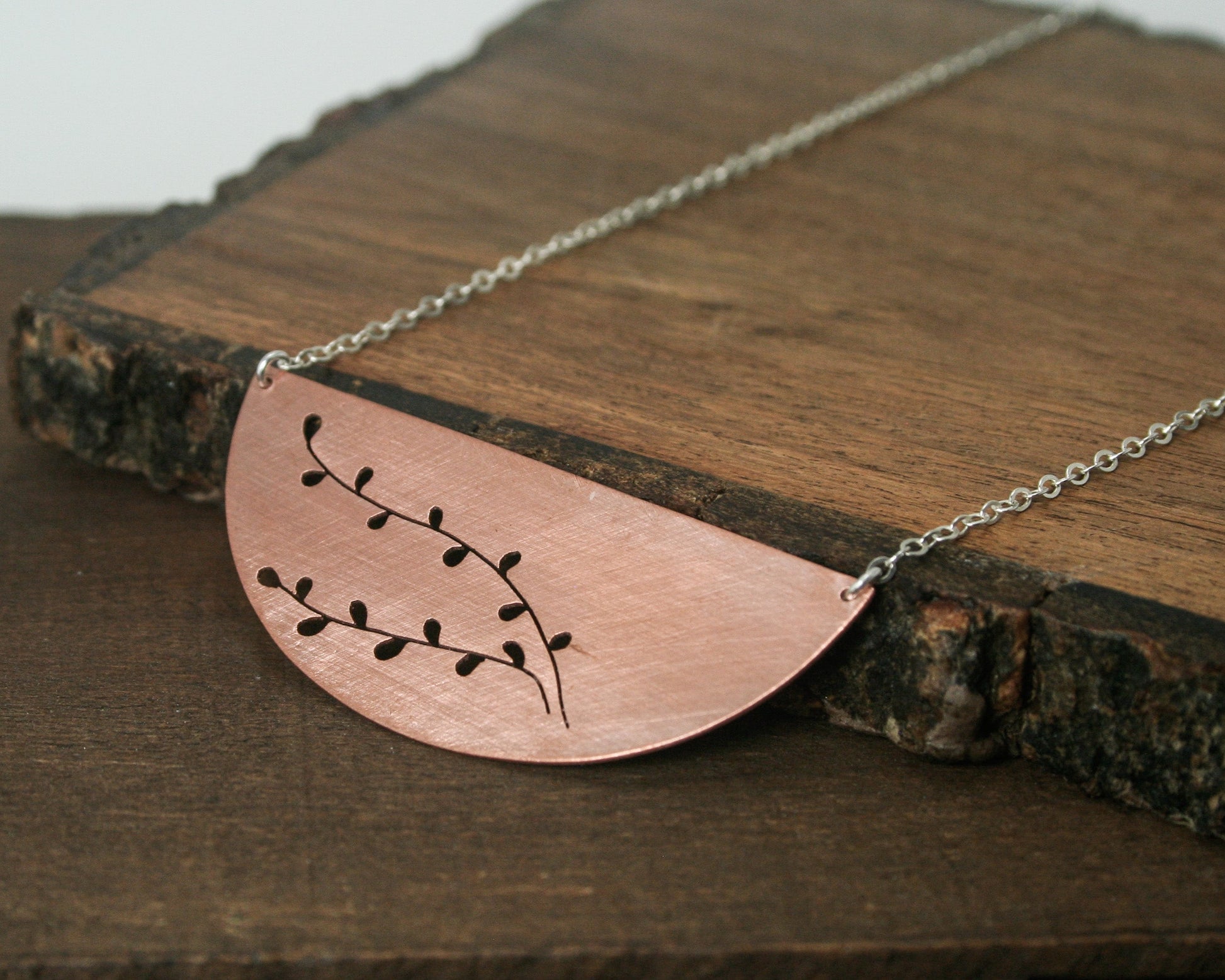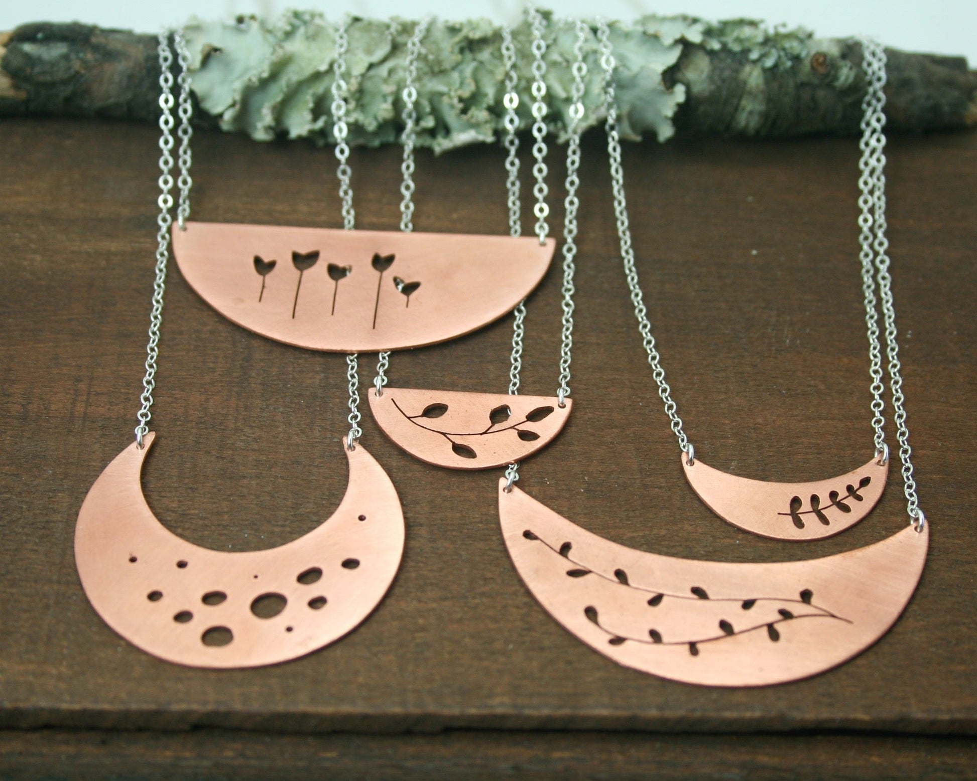 Beautiful copper necklaces featuring unique hand-cut pierced botanical designs.
