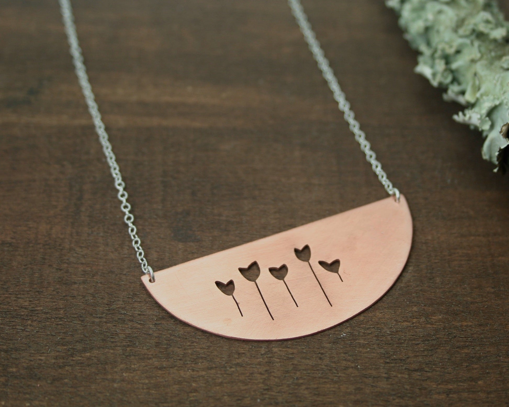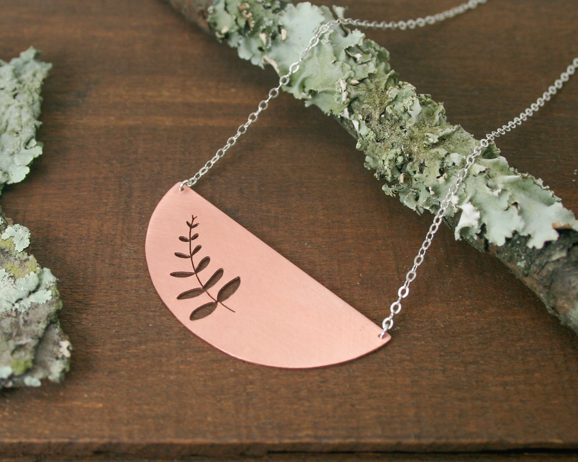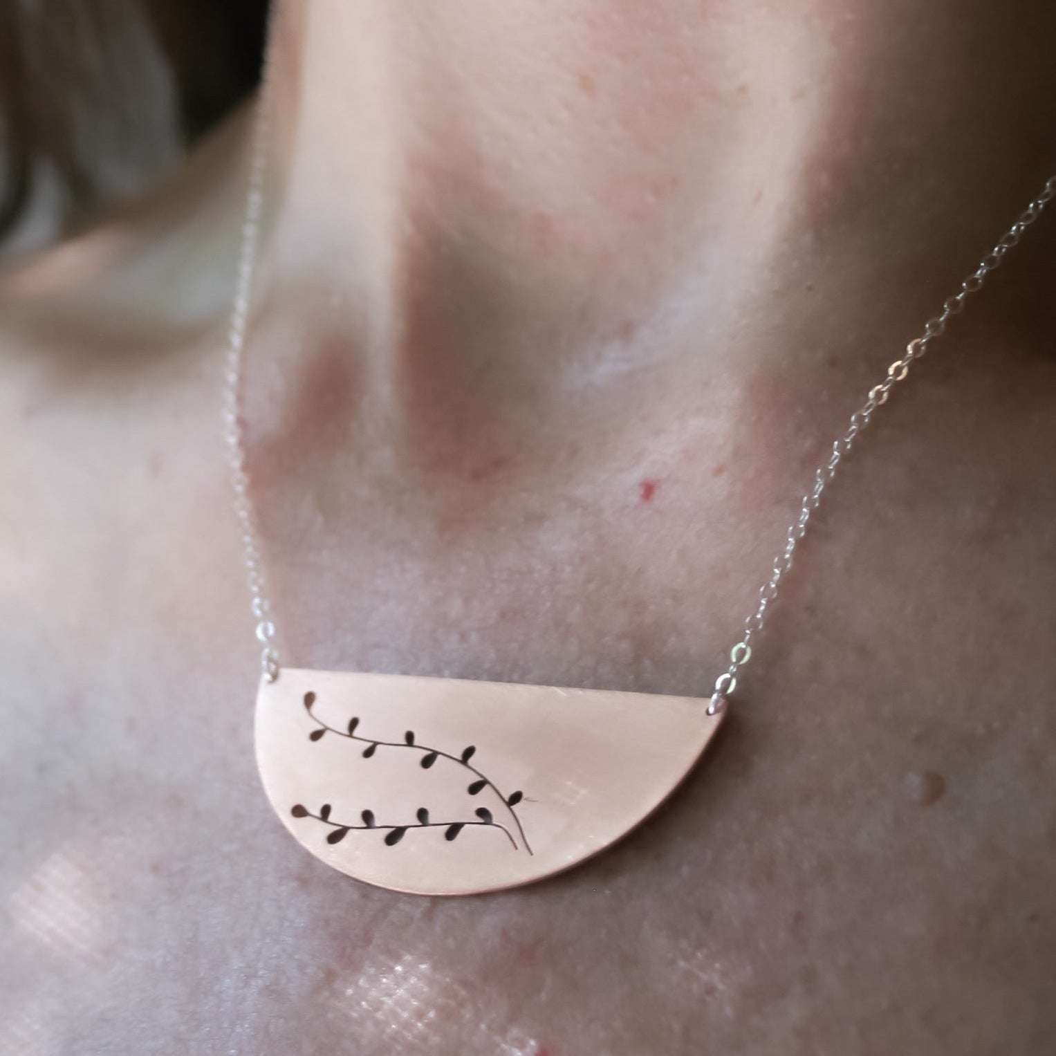Beautiful copper necklaces featuring unique hand-cut pierced botanical designs.