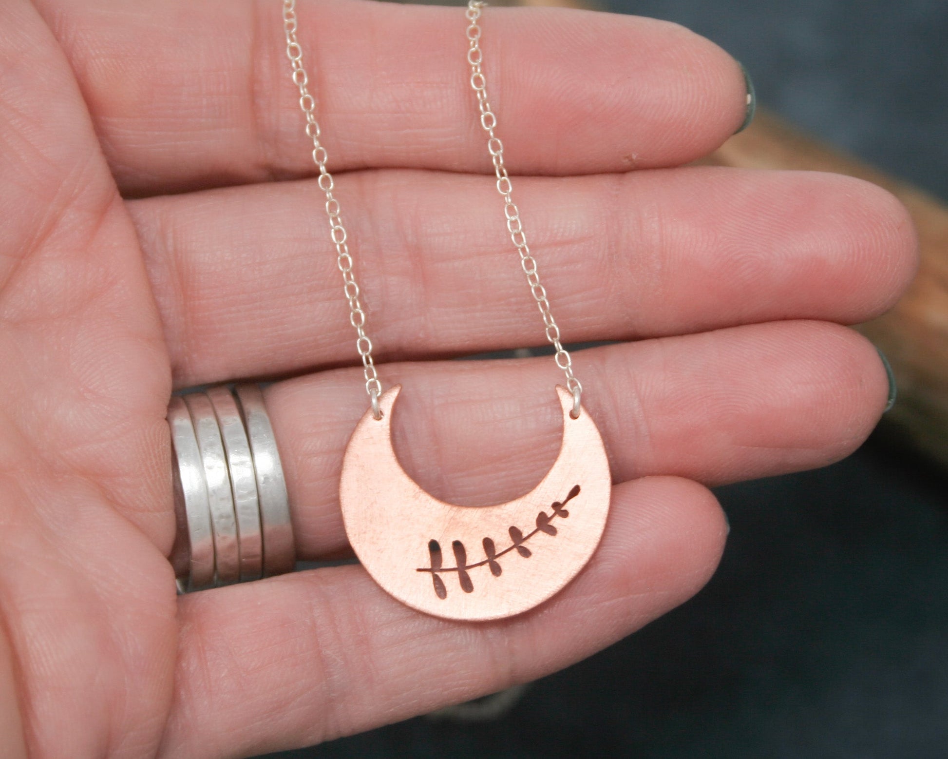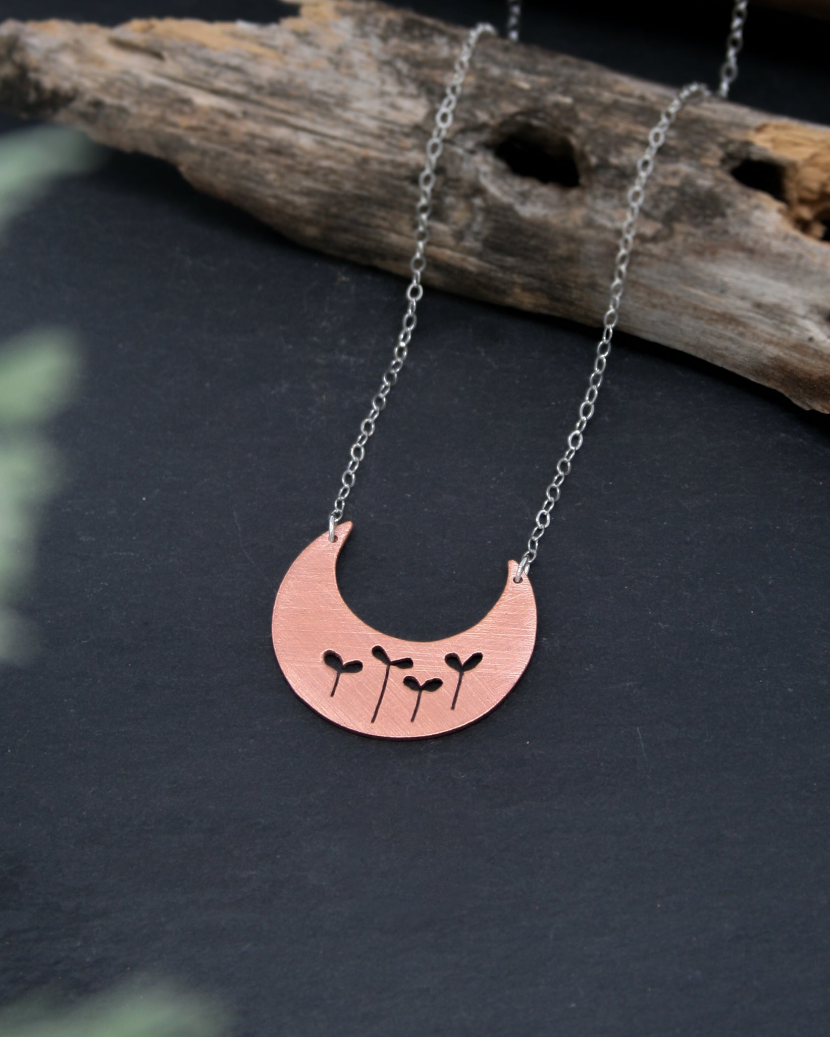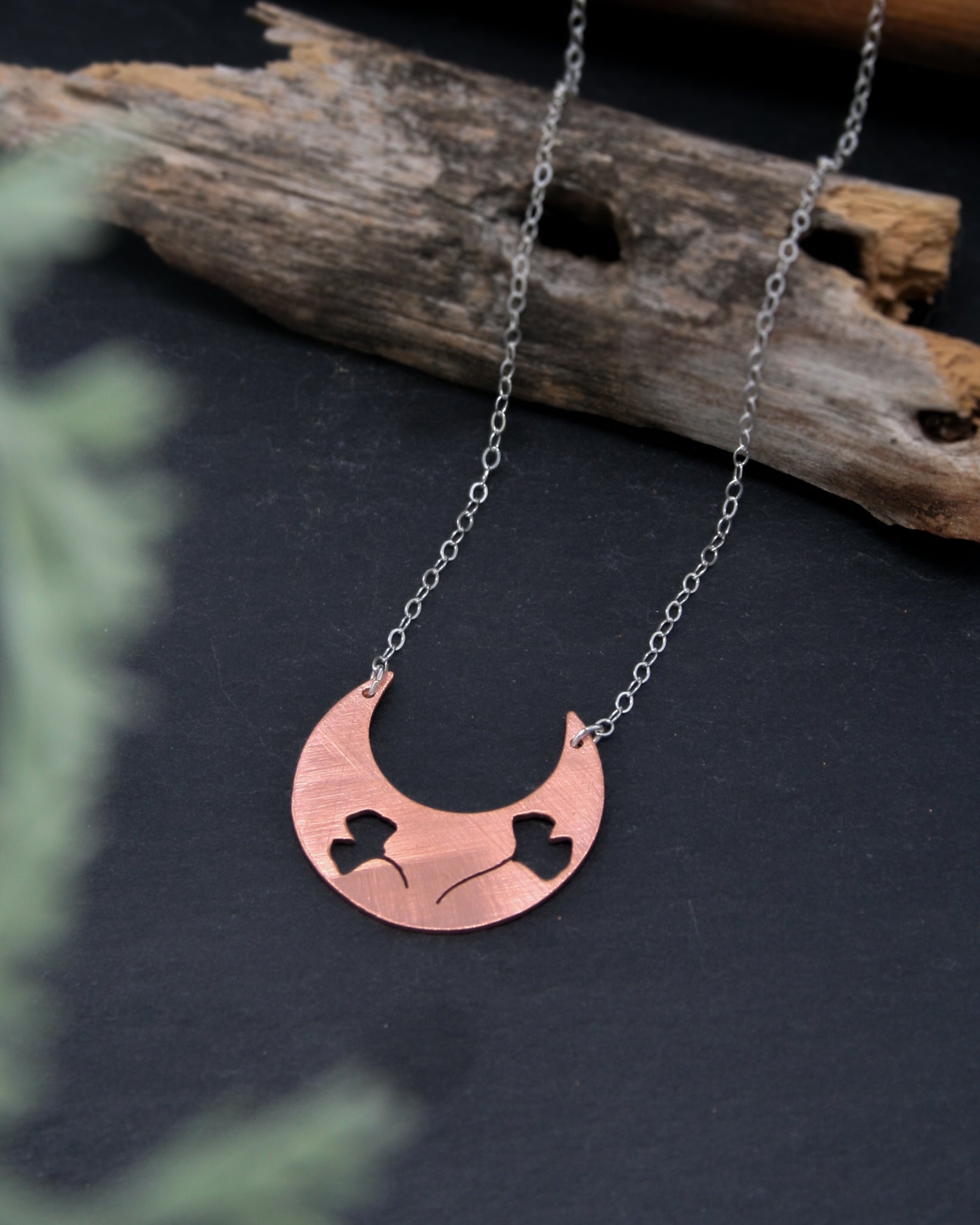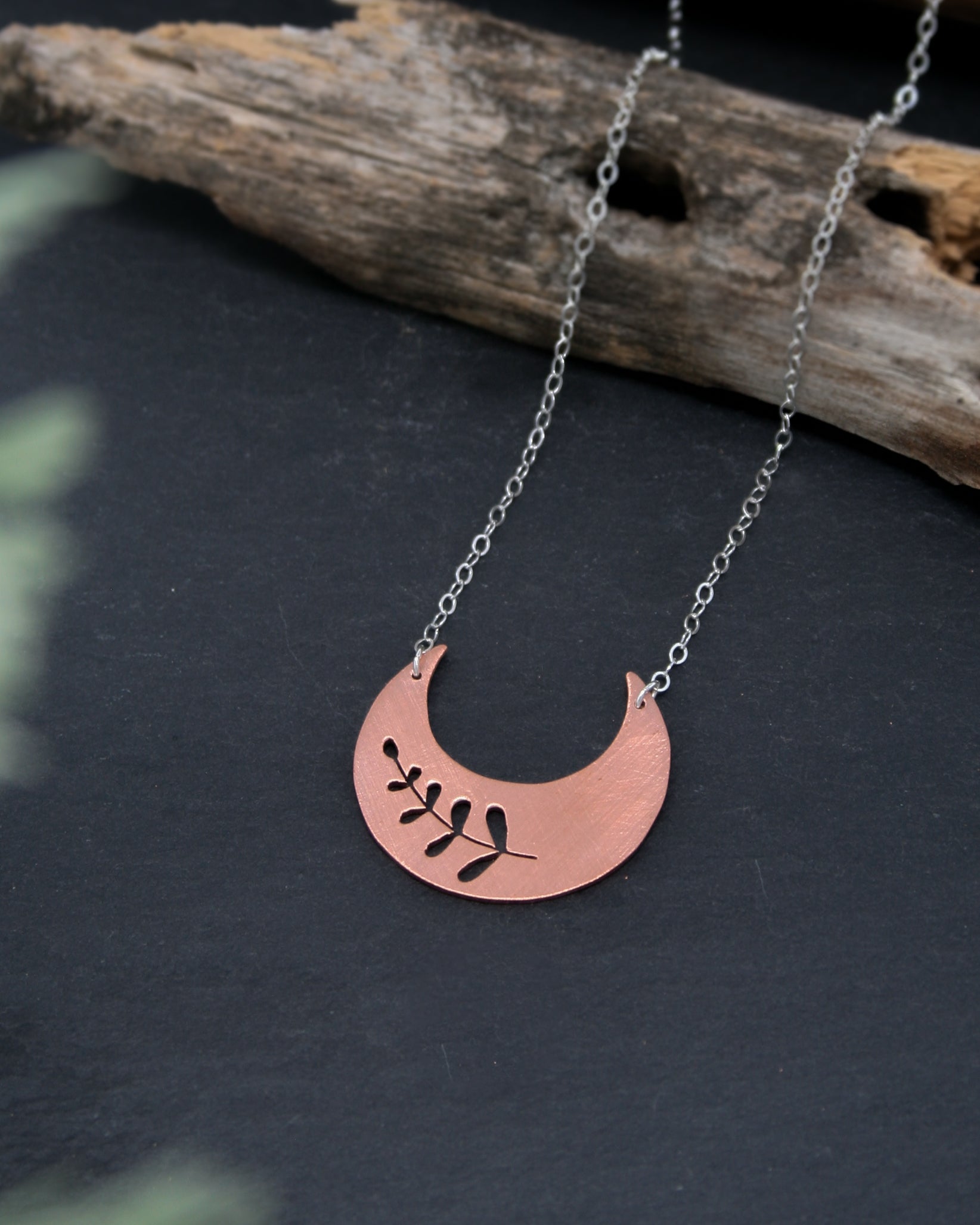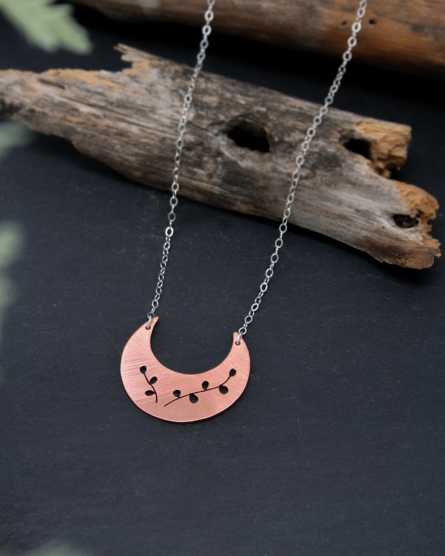 Beautiful copper necklaces featuring unique hand-cut pierced botanical designs.