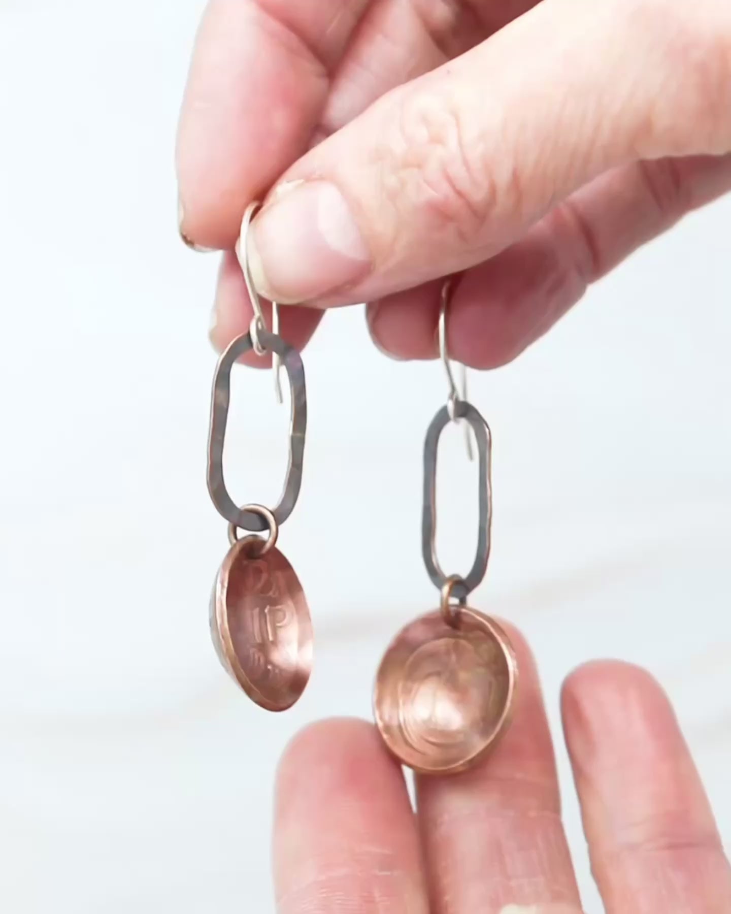 Upcycled coins sourced from countries around the world accented with copper hoops on sterling silver ear wires.