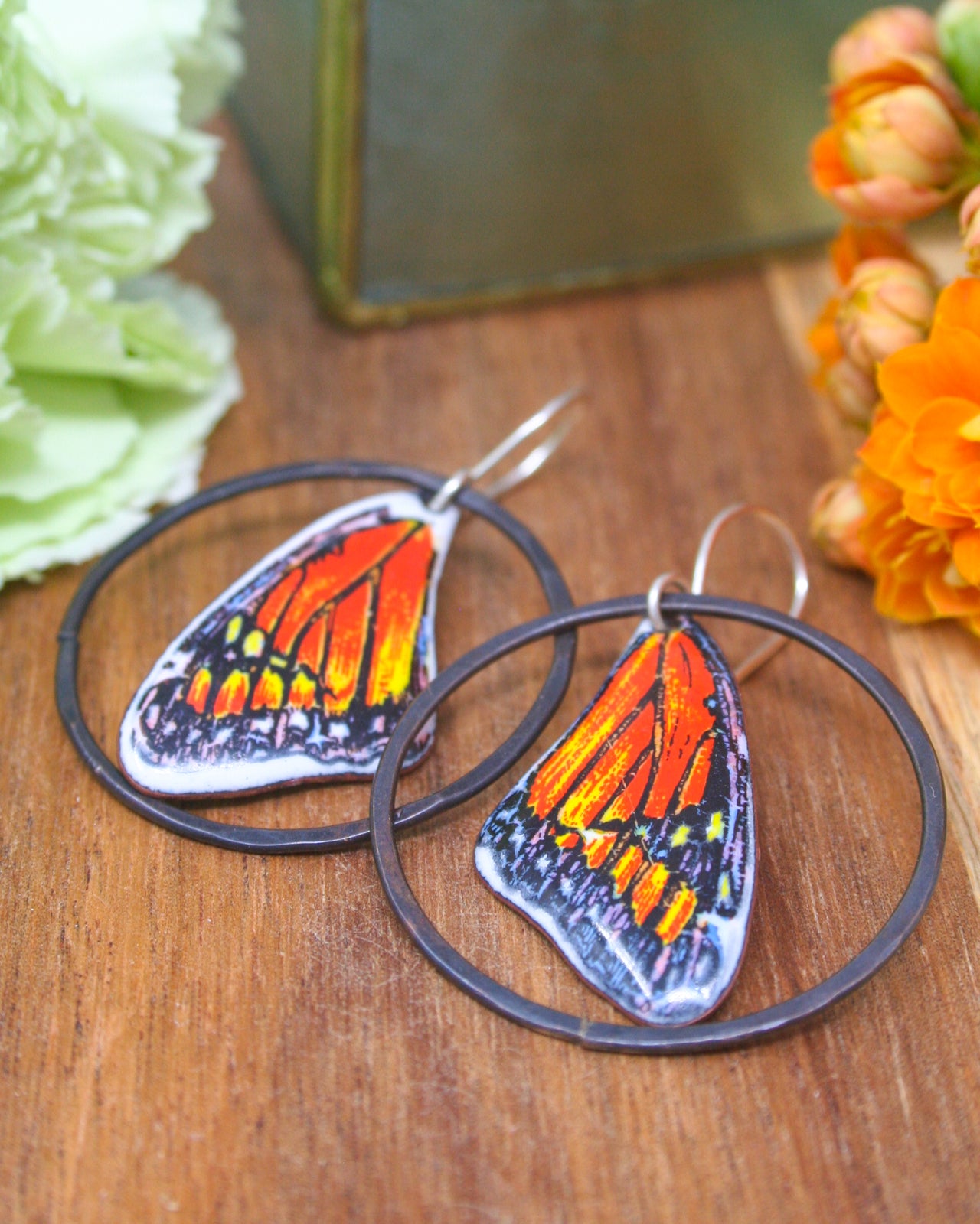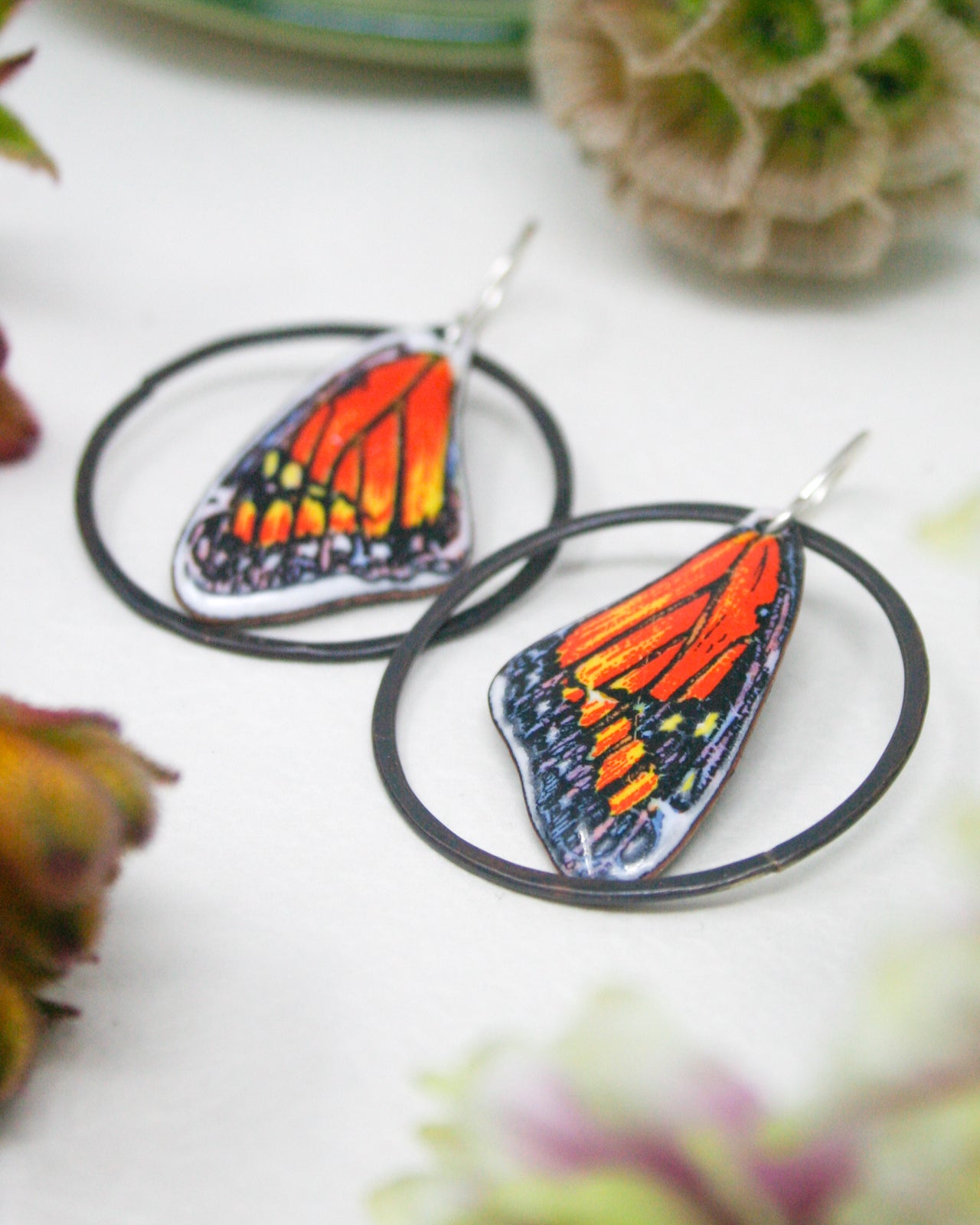 The butterfly symbolizes transformation, resilience, and grace—qualities echoed in these earrings. The subtle patina on the copper adds warmth and depth, while the hand-applied decals bring vintage charm to a modern silhouette. These are meaningful pieces for nature lovers, gardeners, or anyone drawn to the quiet poetry of pollinators.