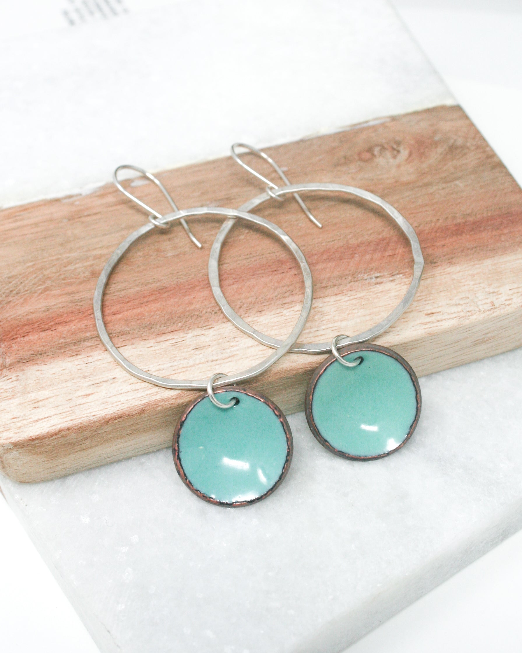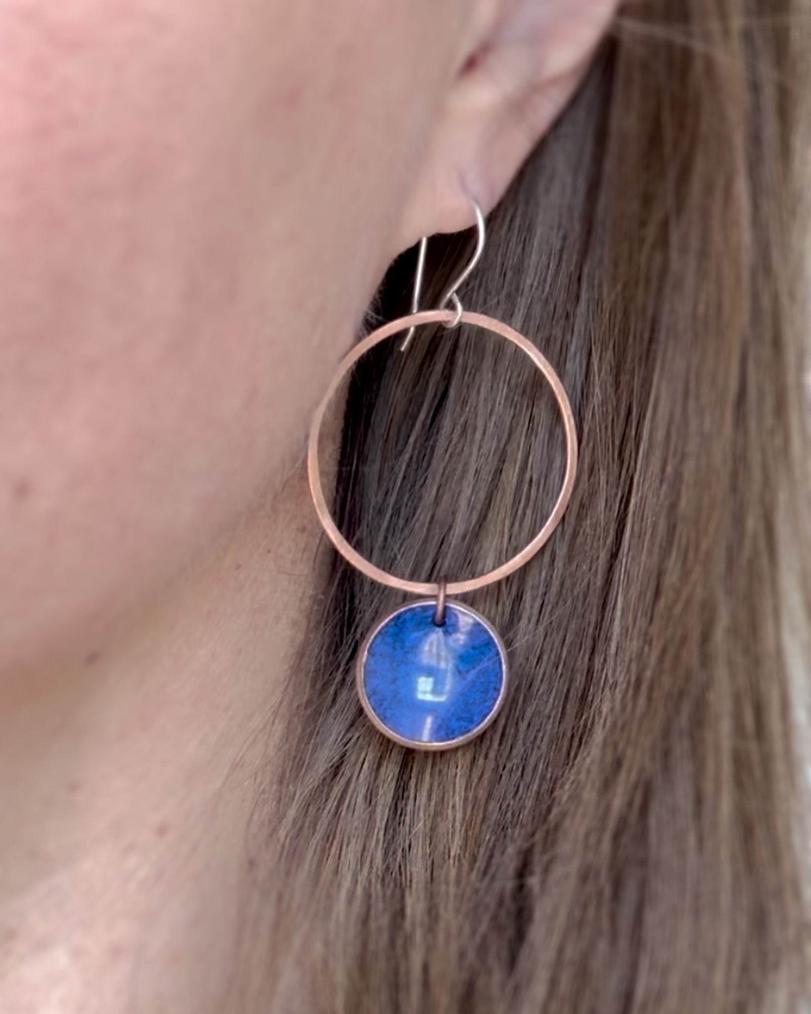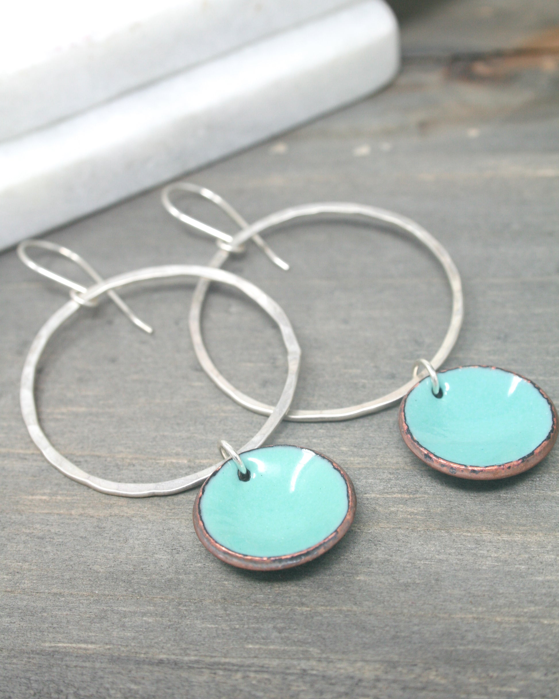 Add a pop of color to your day with these sterling hoop Enamel Penny Earrings. Handmade from real pennies and featuring a vibrant enamel coating, these earrings are a fun and unique addition to any mood. Perfect for adding some extra charm to your style. Finished with sterling silver hooks.