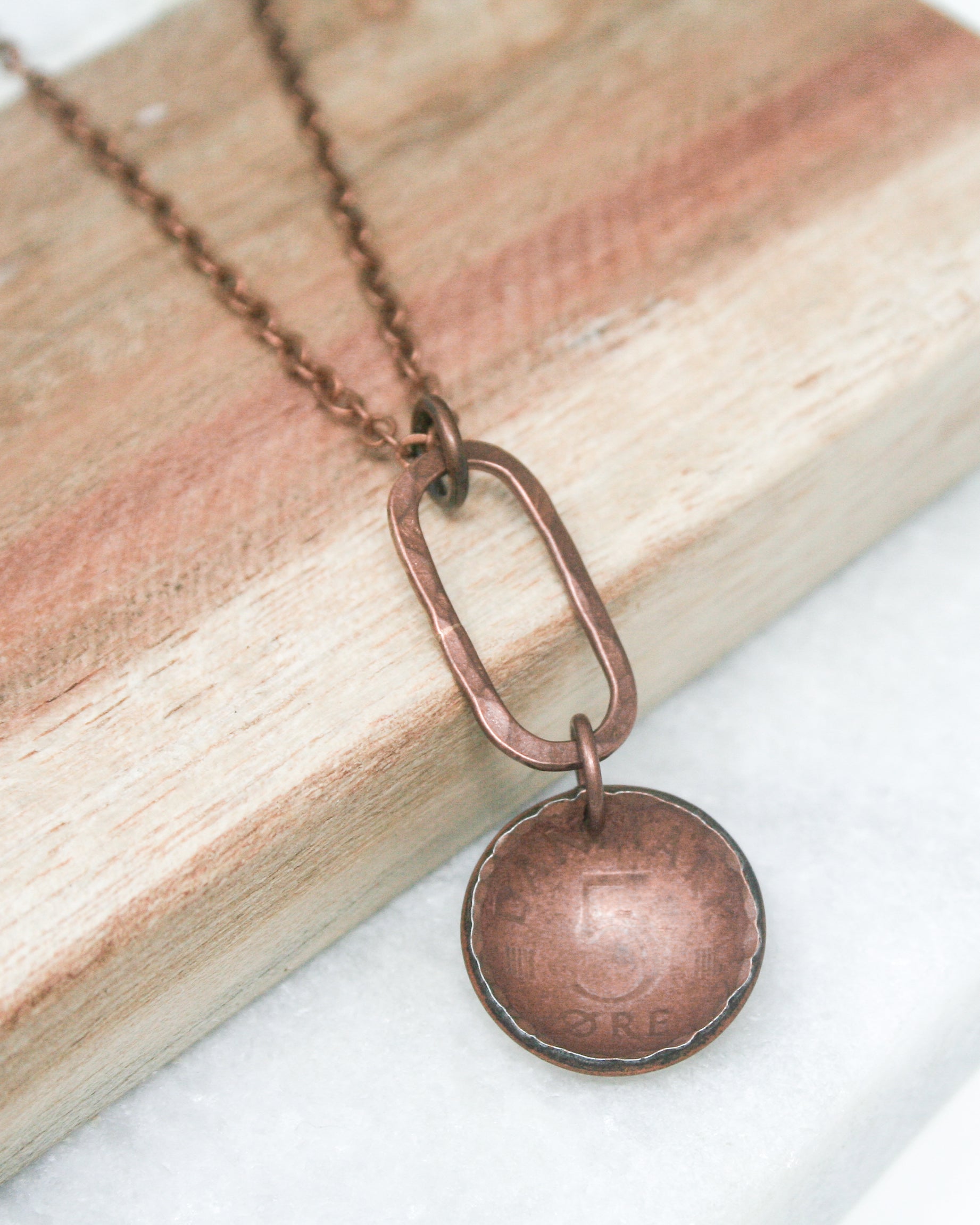 This handmade necklace features a cupped & textured actual coin pendant from Australia, accented with copper, on a silver, copper, or sterling silver chain.