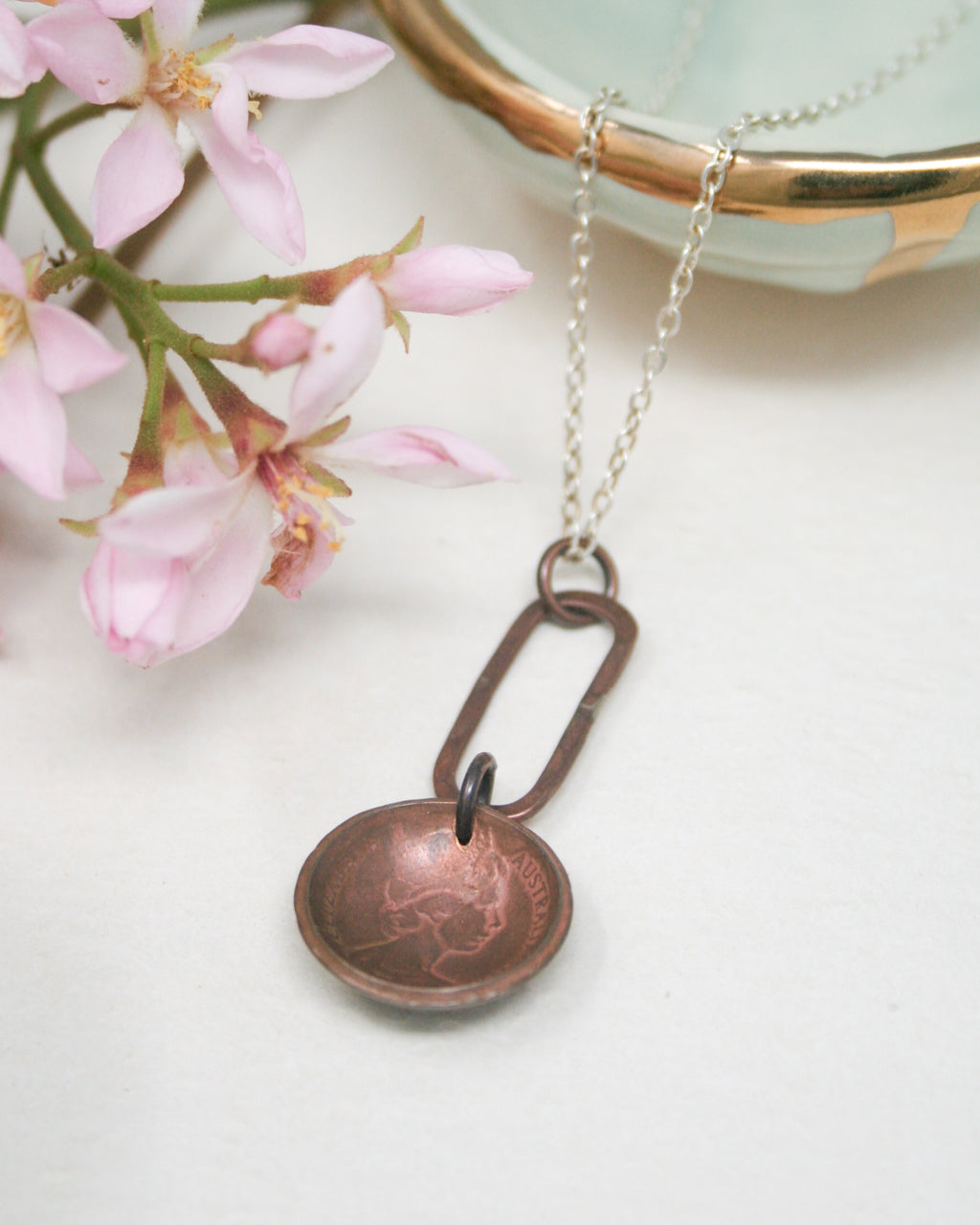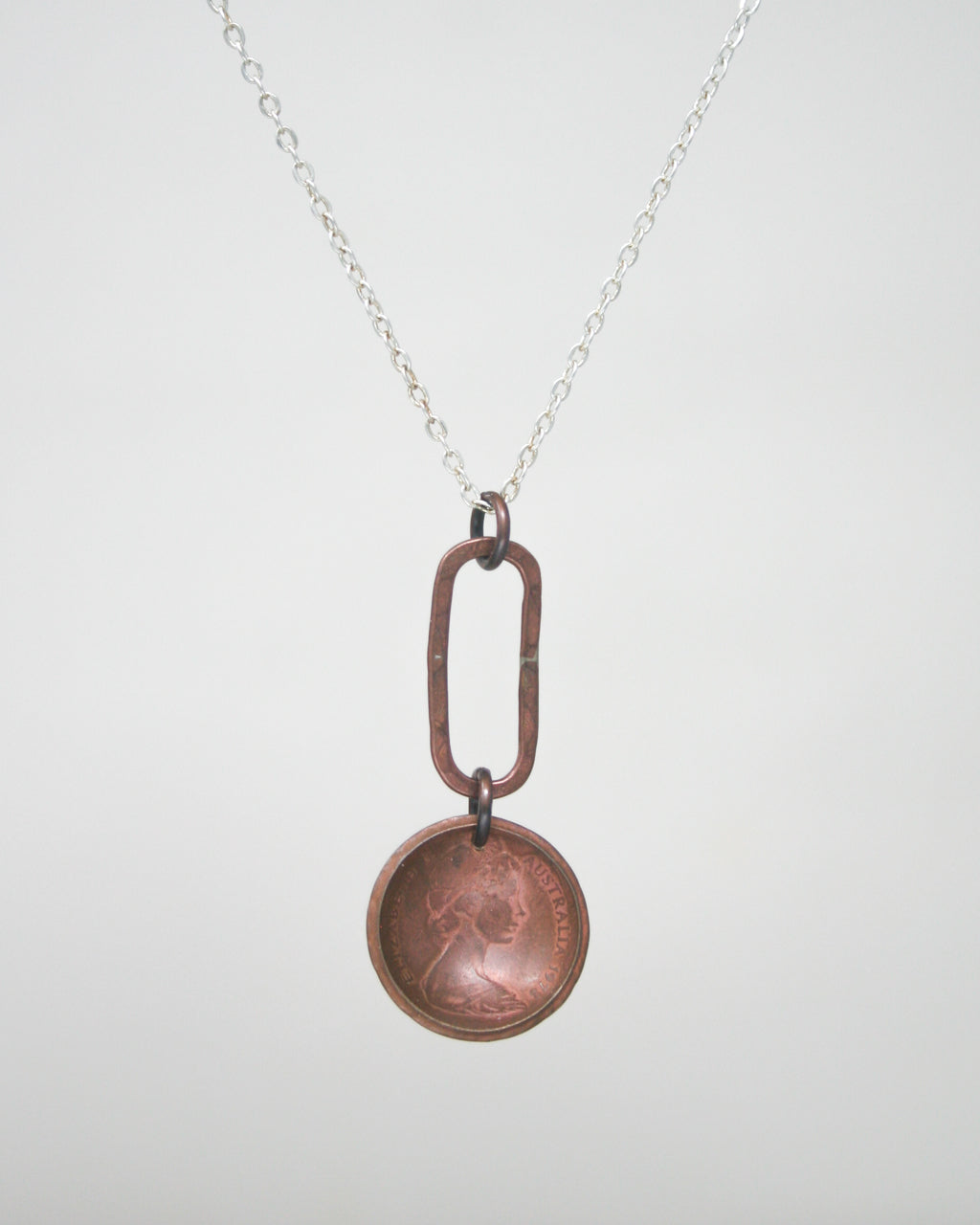 This handmade necklace features a cupped & textured actual coin pendant from Australia, accented with copper, on a silver, copper, or sterling silver chain.