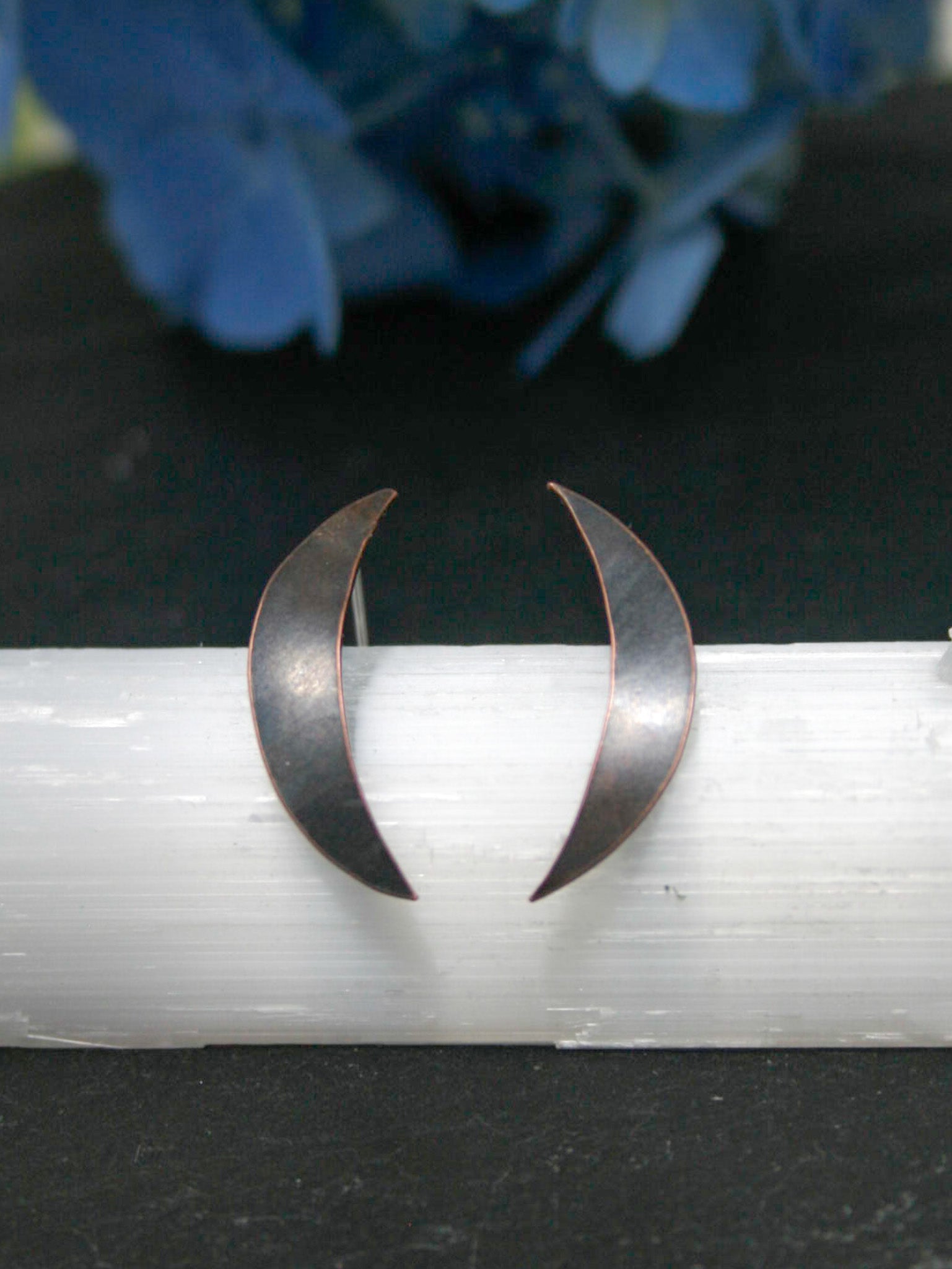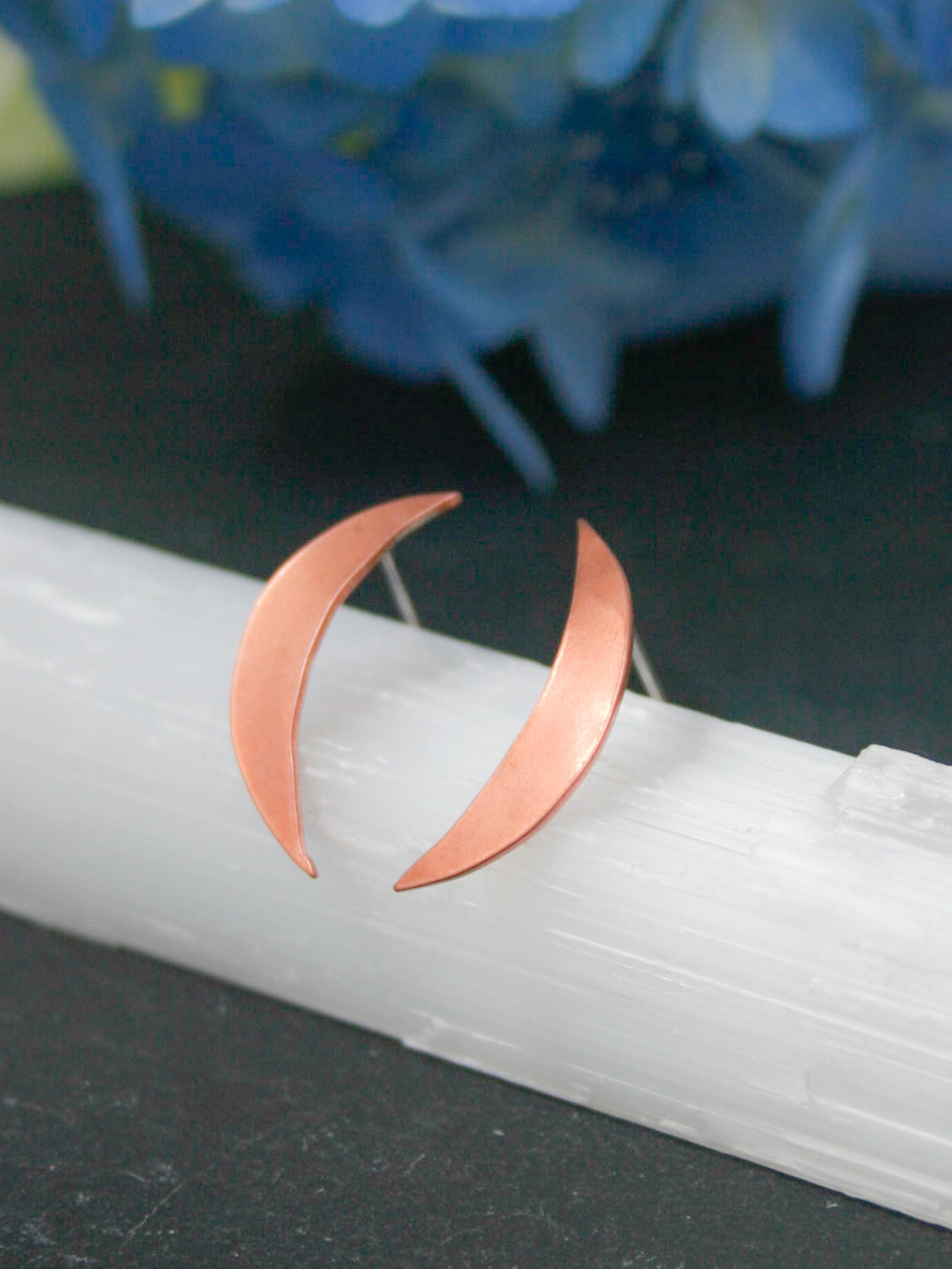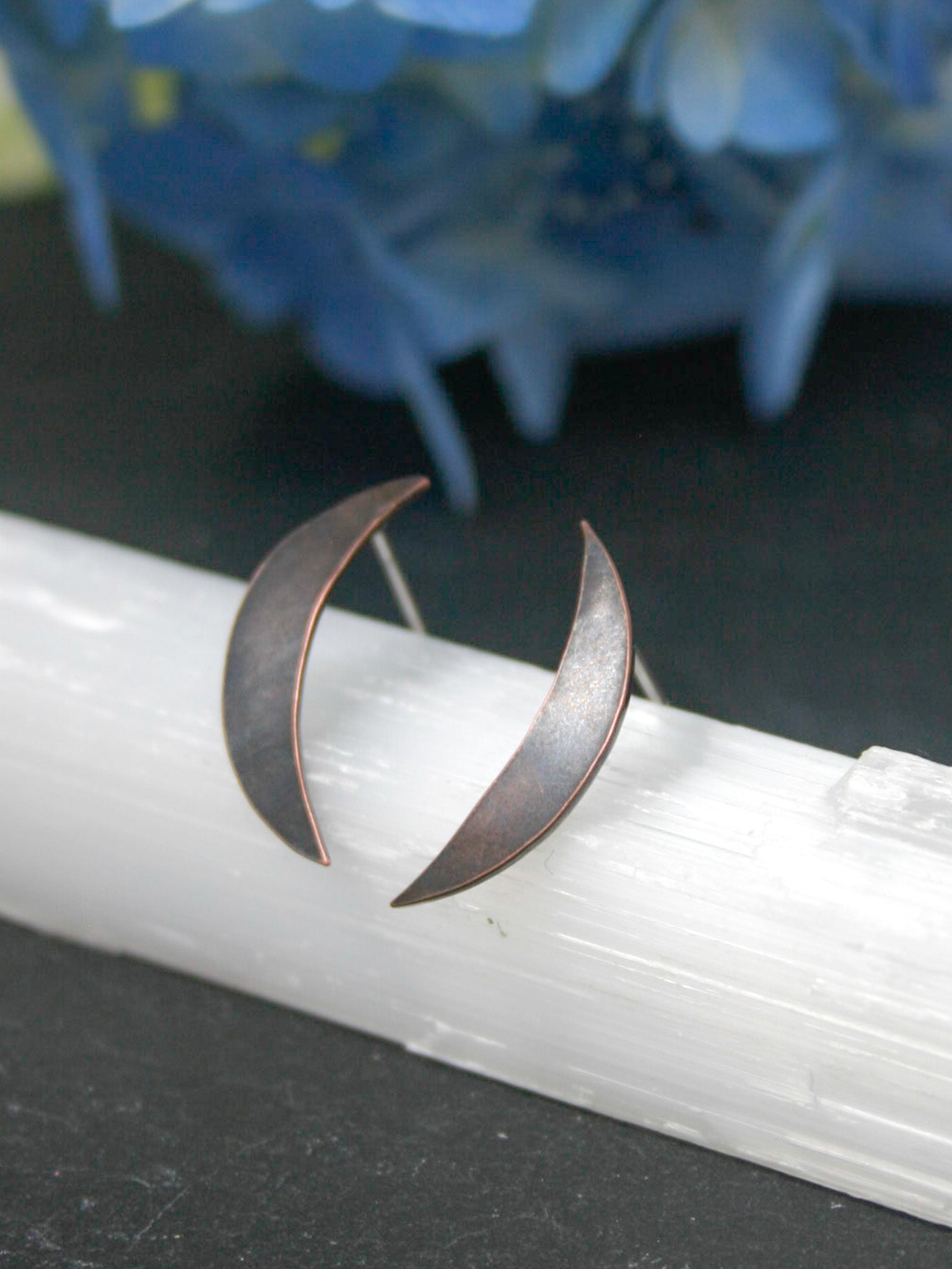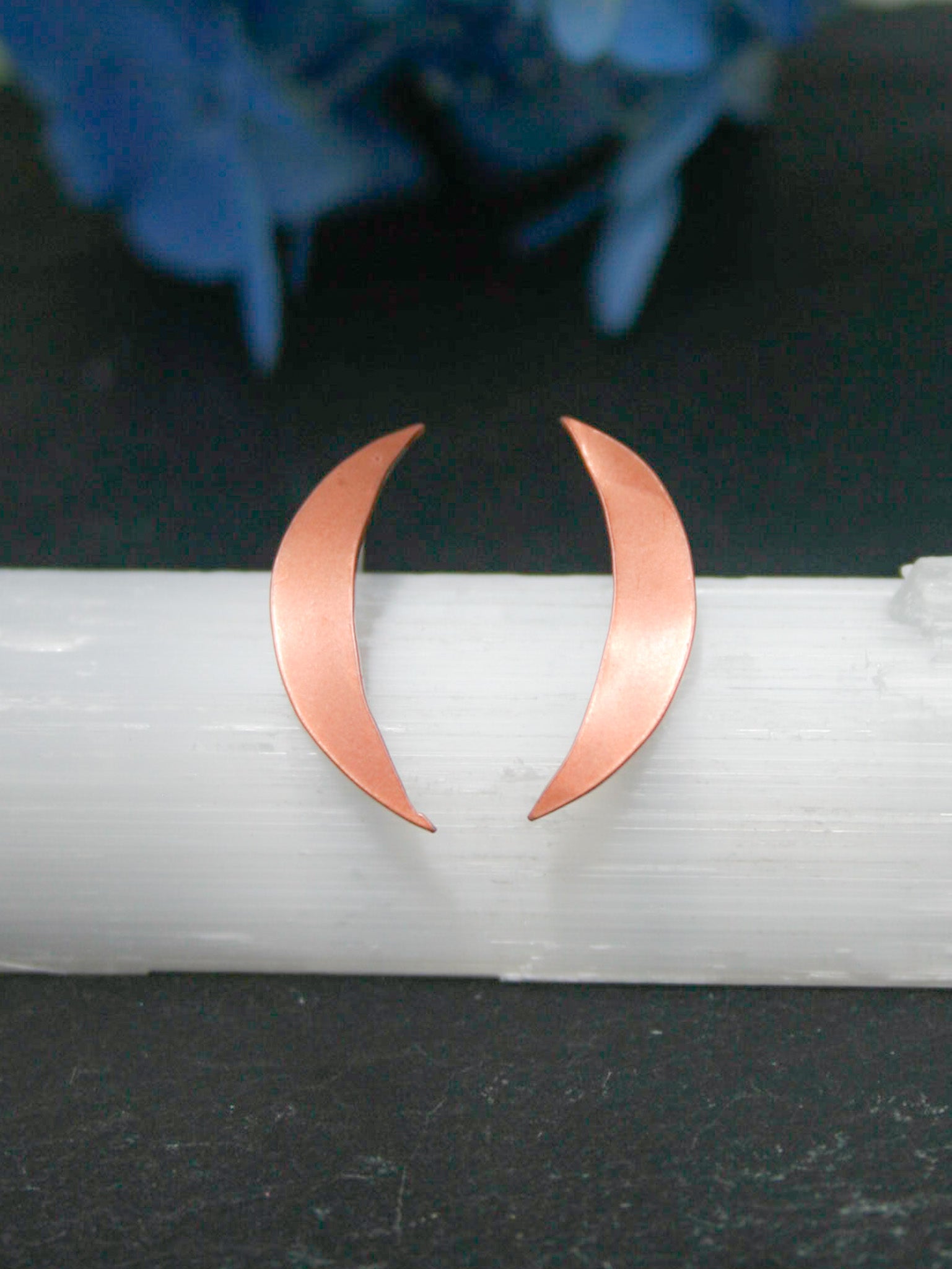 Represent your lunar love with these copper moon studs. Handmade with care, these earrings feature a crescent shape that adds a touch of celestial influence to any outfit. Available in both a dark patina or clean copper finish, these earrings are super versatile and can be worn with any style.