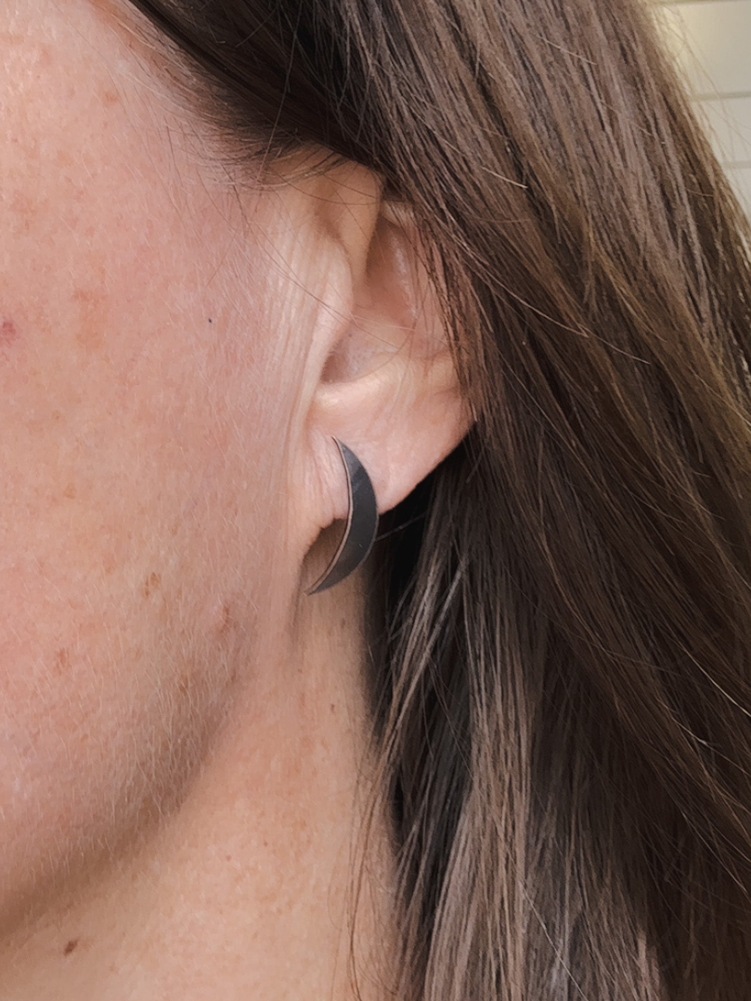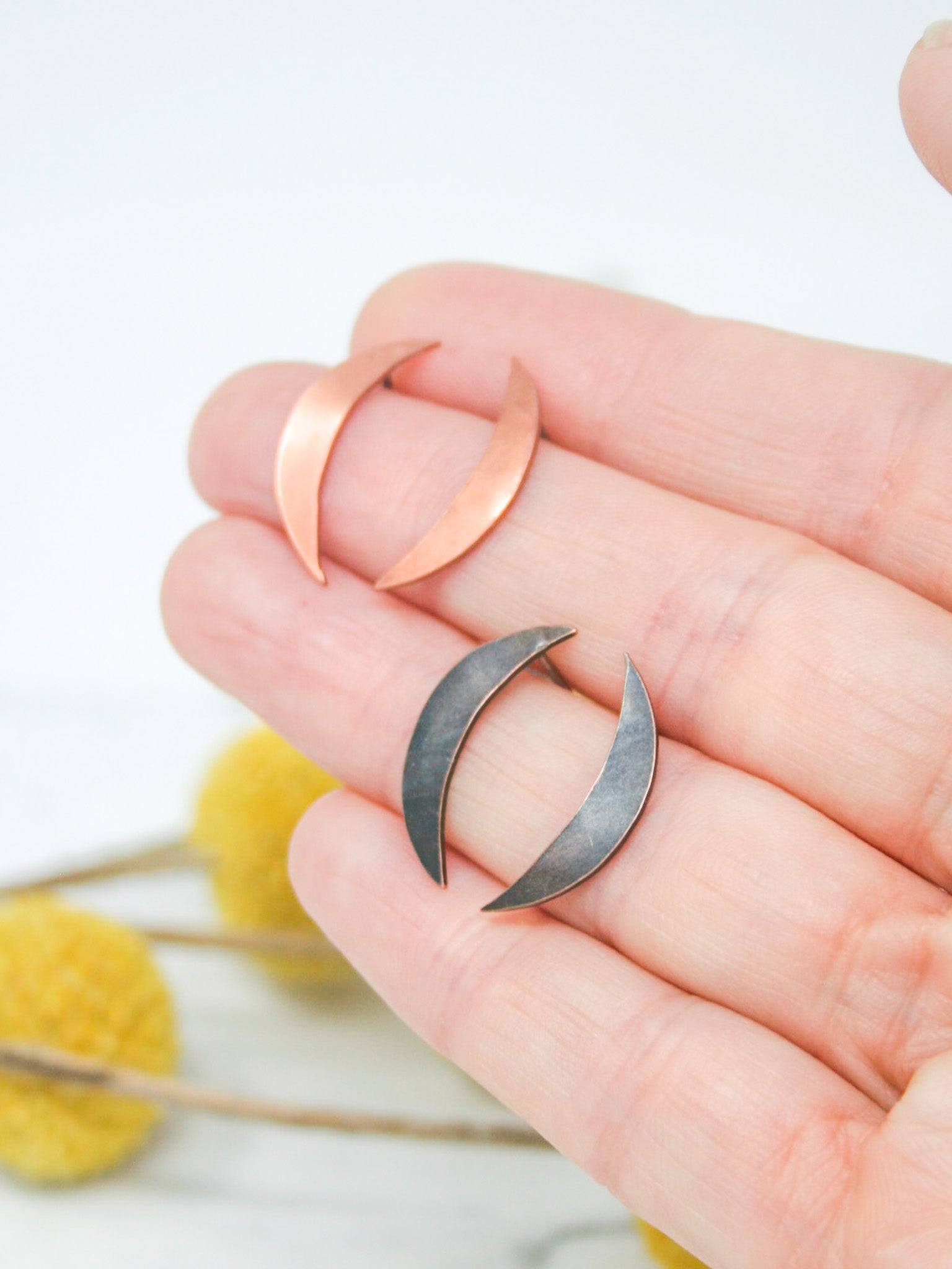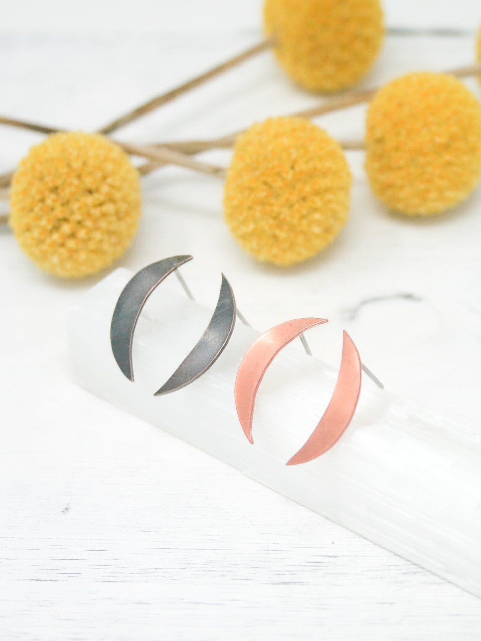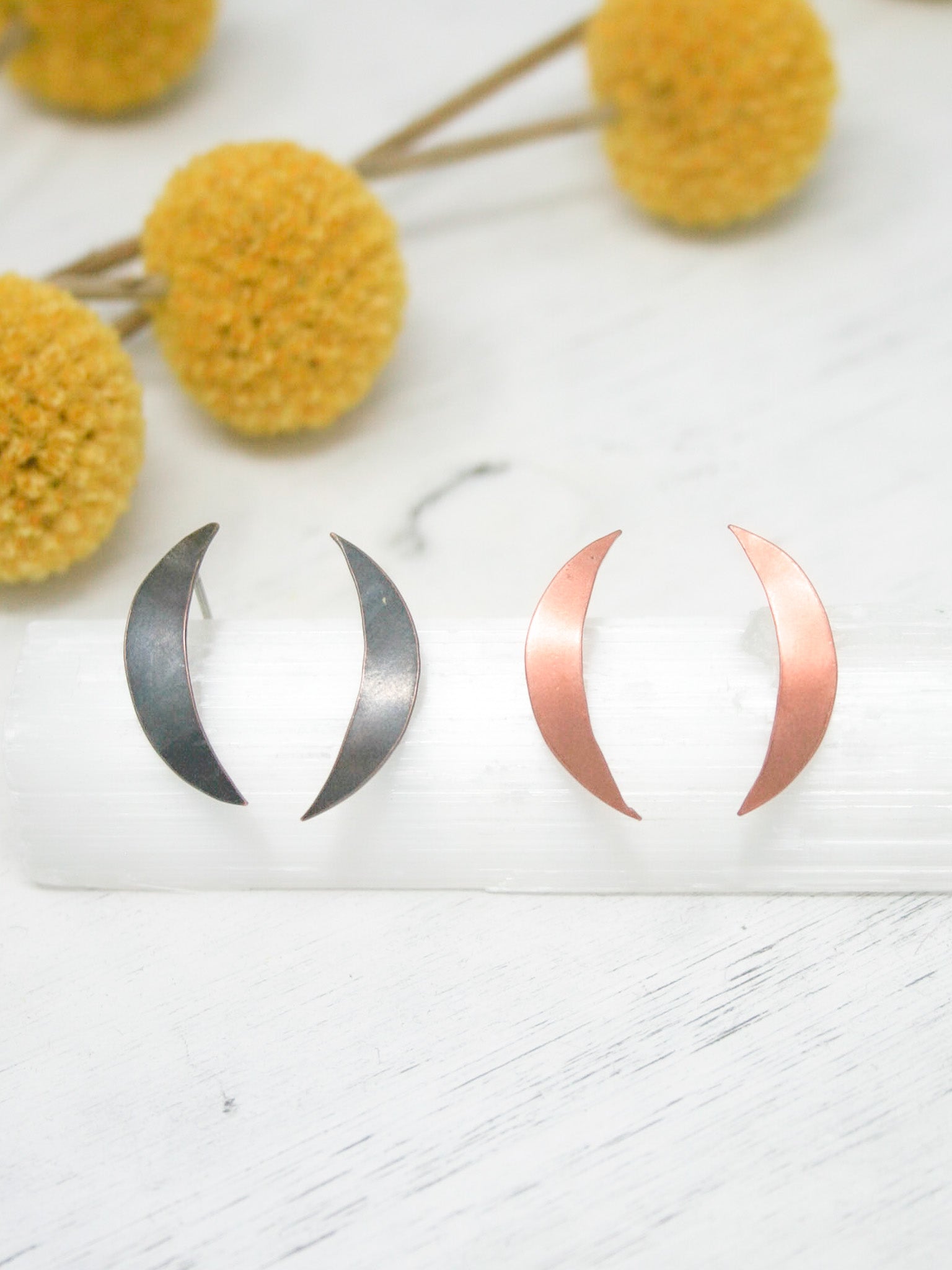 Represent your lunar love with these copper moon studs. Handmade with care, these earrings feature a crescent shape that adds a touch of celestial influence to any outfit. Available in both a dark patina or clean copper finish, these earrings are super versatile and can be worn with any style.