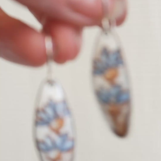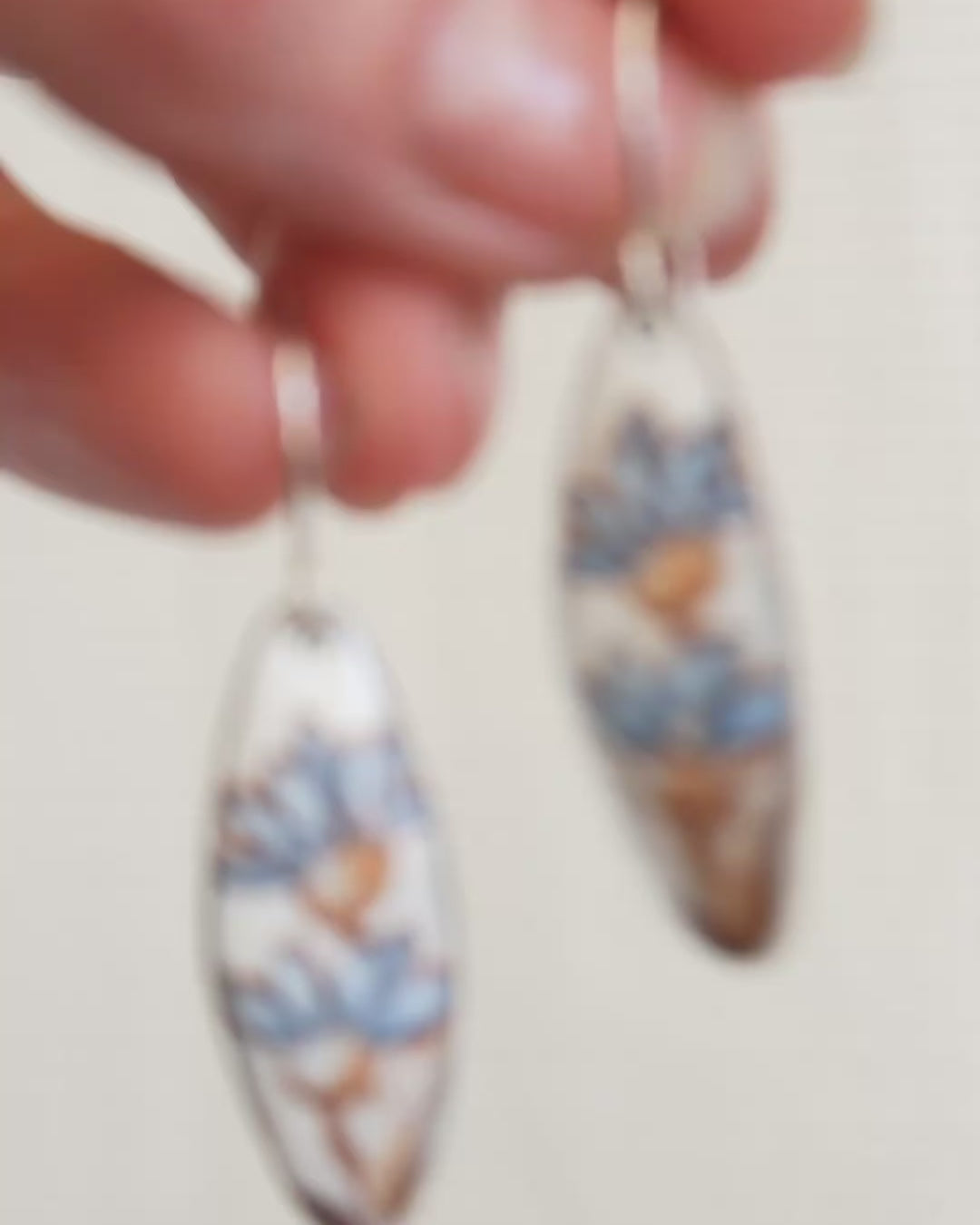 These Daisy Earrings celebrate the birth flower of April. Handmade in small batches using enameled copper and vintage ceramic decals, each pair is lightweight and easy to wear.