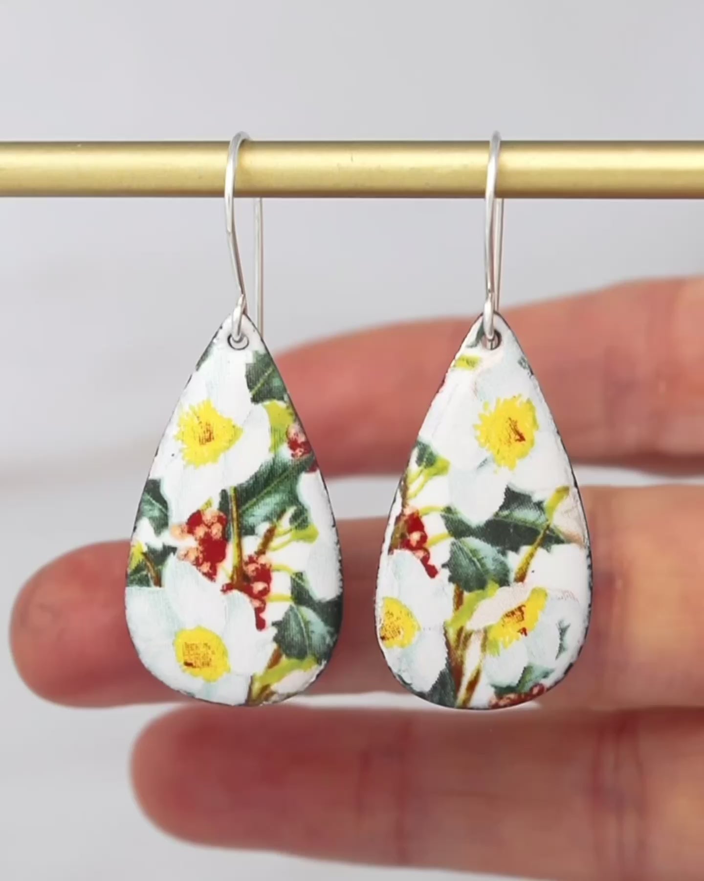 Holly earrings to capture the celebratory spirit of December's birth flower with a blend of vintage charm and nostalgia. Handmade with copper, enamel, and vintage ceramic decals, each pair offers a lightweight teardrop design finished with sterling silver ear wires for everyday comfort.