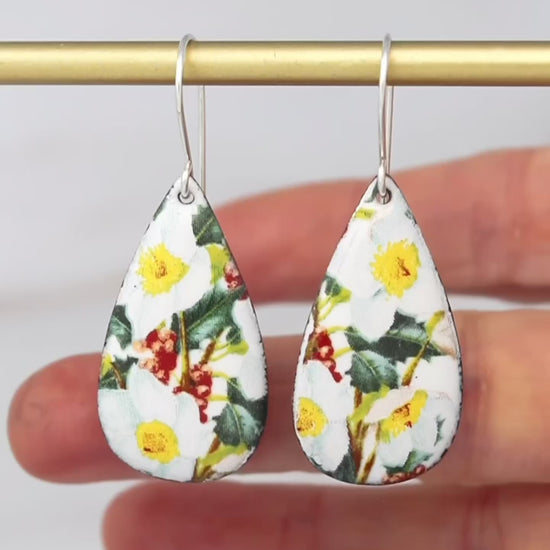 Holly earrings to capture the celebratory spirit of December's birth flower with a blend of vintage charm and nostalgia. Handmade with copper, enamel, and vintage ceramic decals, each pair offers a lightweight petal shape design finished with sterling silver ear wires for everyday comfort.