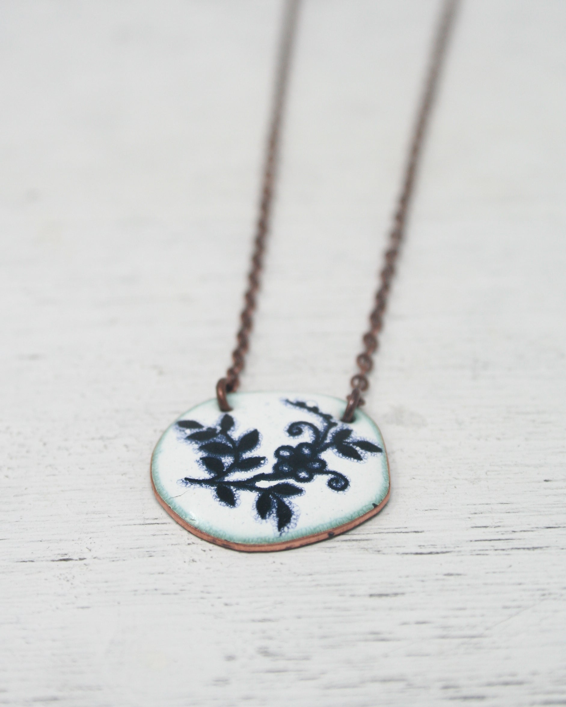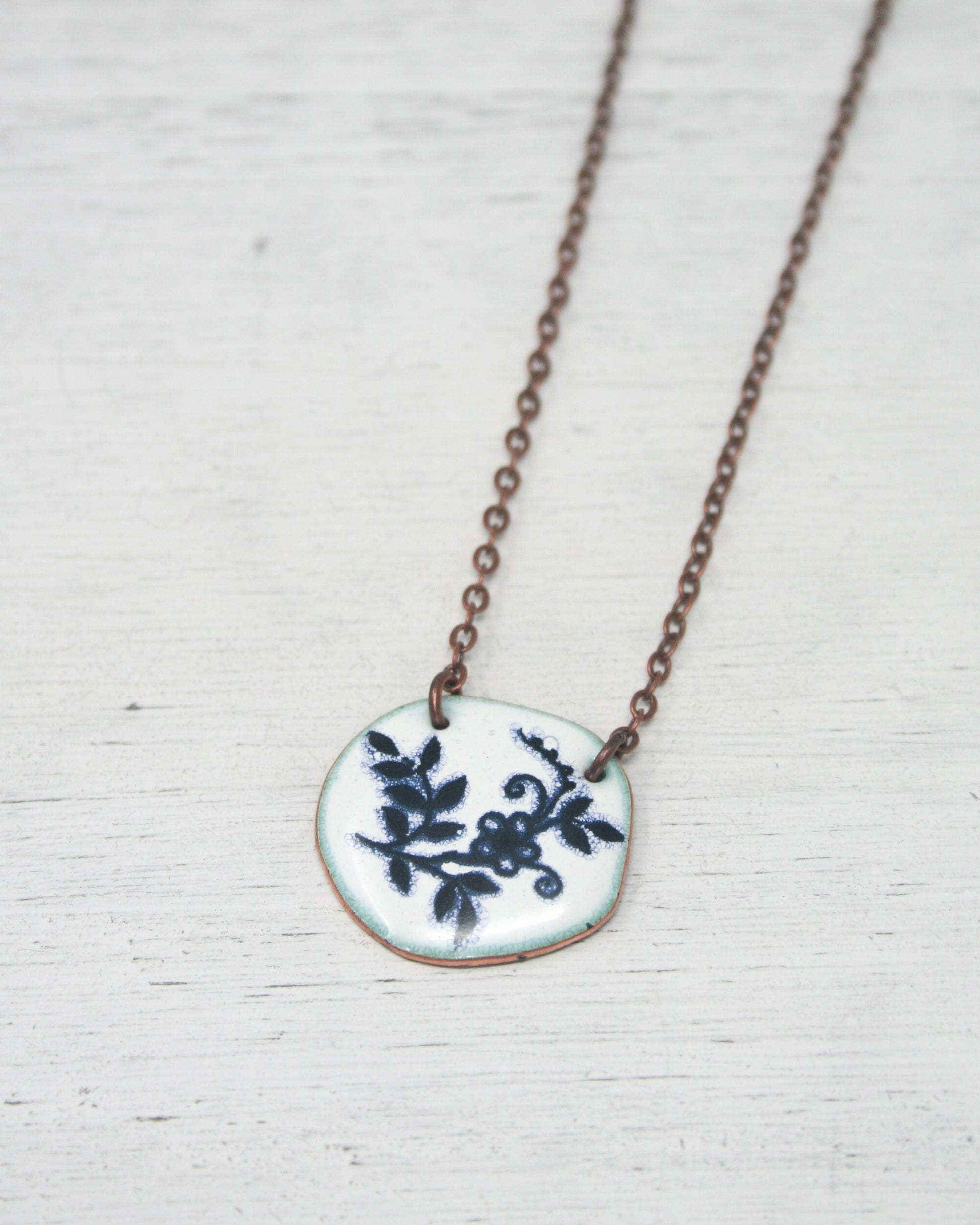 A sweet necklace with a nostalgic vintage ceramic patterns on an white enamel background.