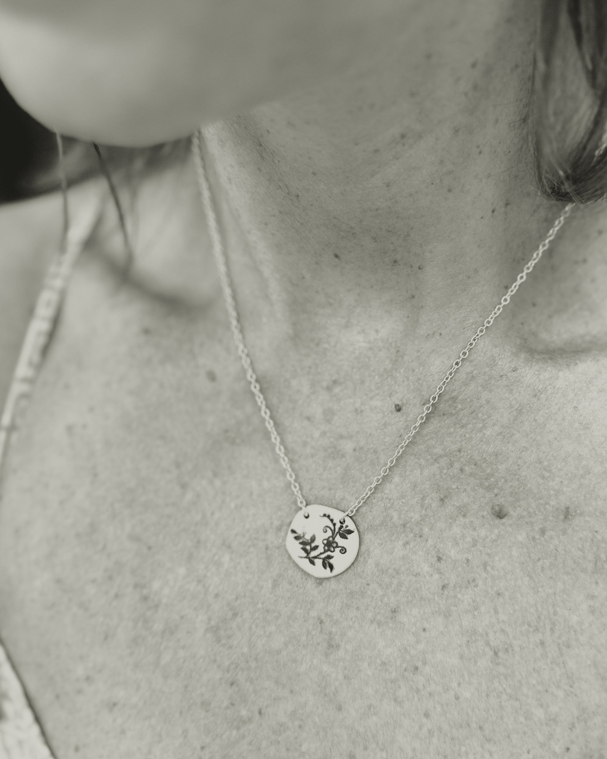 Finished with 16-18" silver, copper, or sterling silver chain.